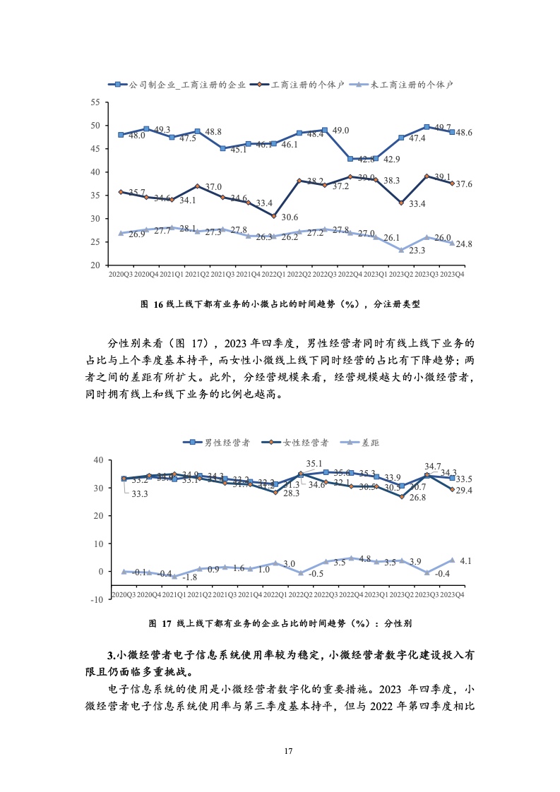 5、小微数字化程度方面,小微经营者电子信息系统使用基本稳定, 较2022 年同期提升明显,线上销售比例小幅上升。 2023年四季度,79.7%的小微经营者采用了电子信息系统,环比增长3.4 个百分点;有线上销售的小微经营者占比与上季度相比基本持平;线上线下都有销售业务的小微经营者占比稳中有降,多平台经营的小微经营者占比略有上涨。