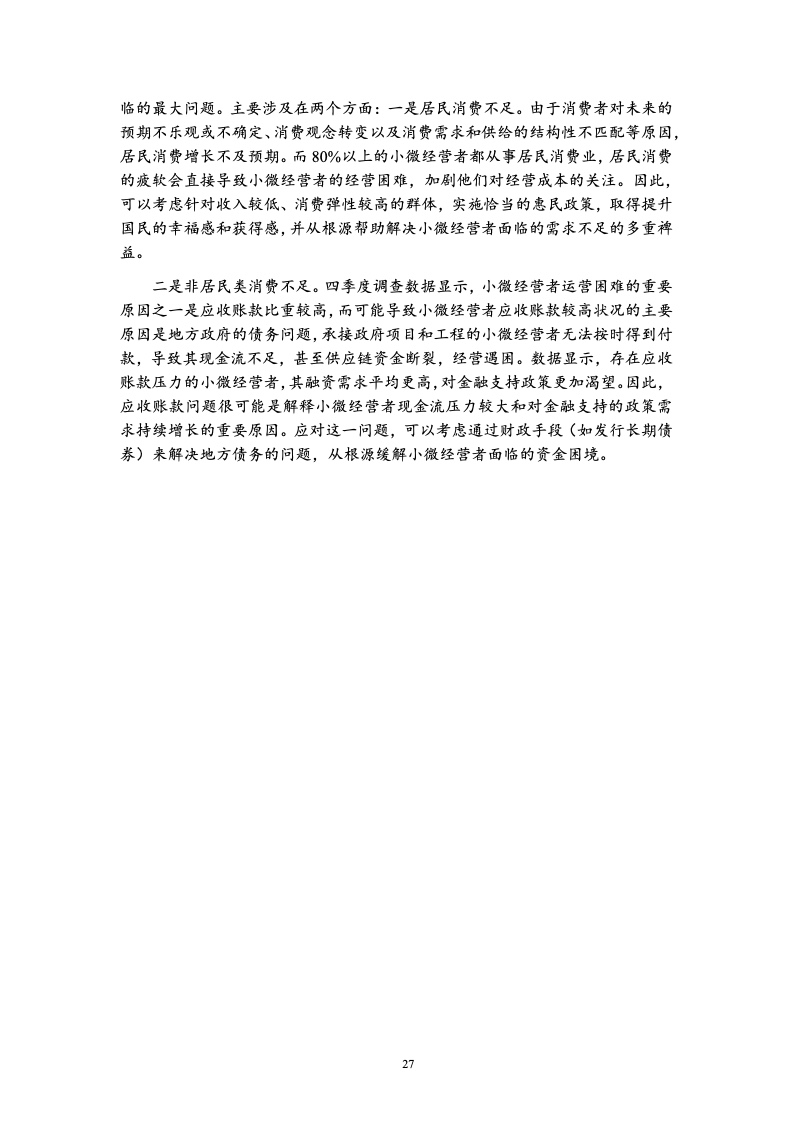 6、小微经营者应收账款比重较高。四季度调查数据显示,小微应收账款均值为 10 万元,占季度营业收入的 67% (约占年营业收入的 17%)。存在应收账款压力的小微经营者,其平均融资需求也更高。