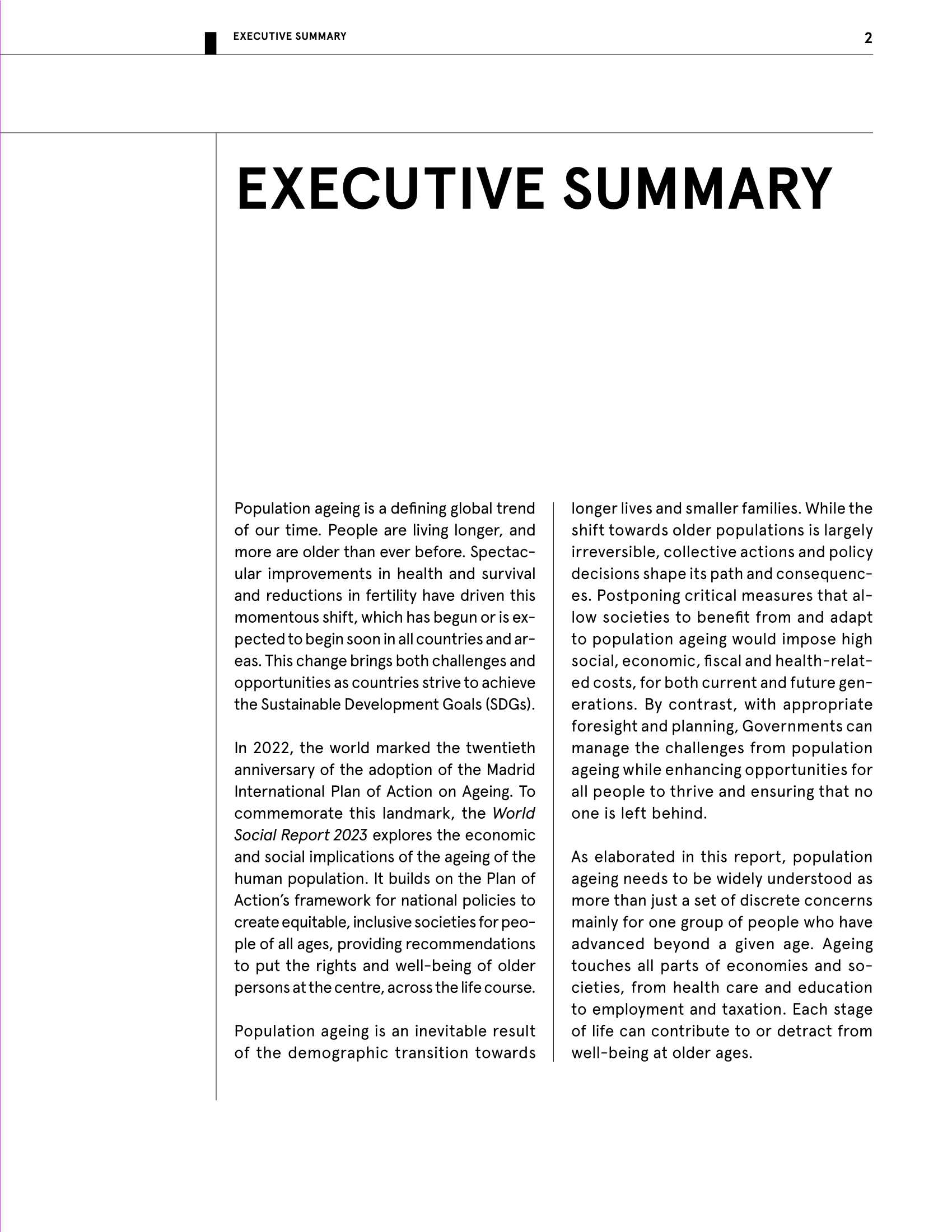 2022年,全世界纪念《马德里老龄问题国际行动计划》通过20周年。为纪念这一里程碑,报告探讨了人口老龄化对经济和社会的影响。它以行动计划的国家政策框架为基础,为所有年龄段的人创造公平、包容的社会,并提出建议——将老年人的权利和福祉置于整个生命历程的中心位置。