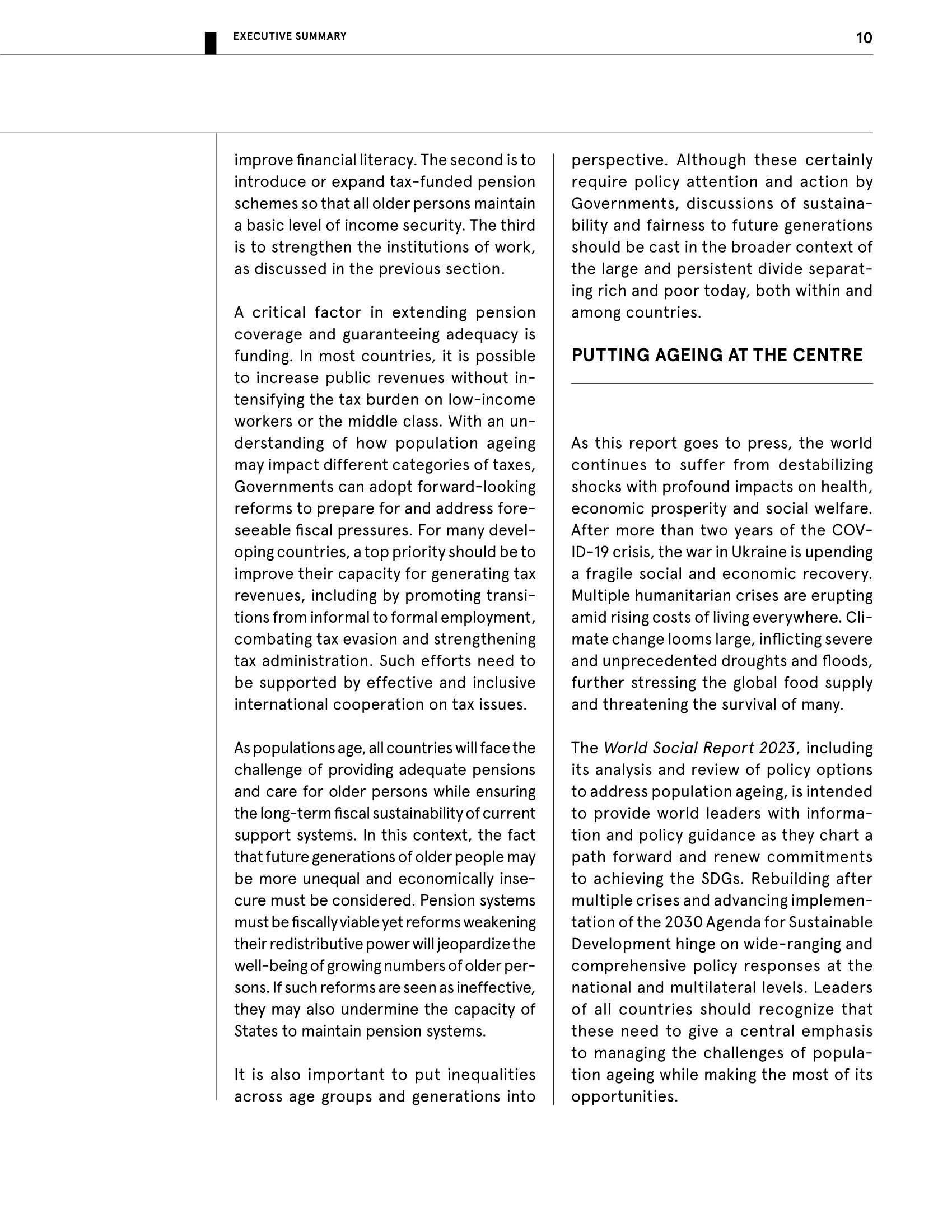 正如报告所阐述的那样,人口老龄化需要被广泛理解为不仅仅是一组主要针对已超过特定年龄的群体的问题。老龄化涉及经济和社会的各个方面,从医疗保健和教育到就业和税收。人生的每个阶段都可能促进或损害老年人的幸福。