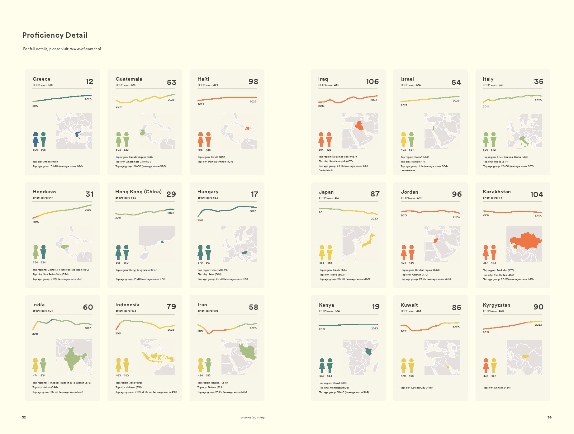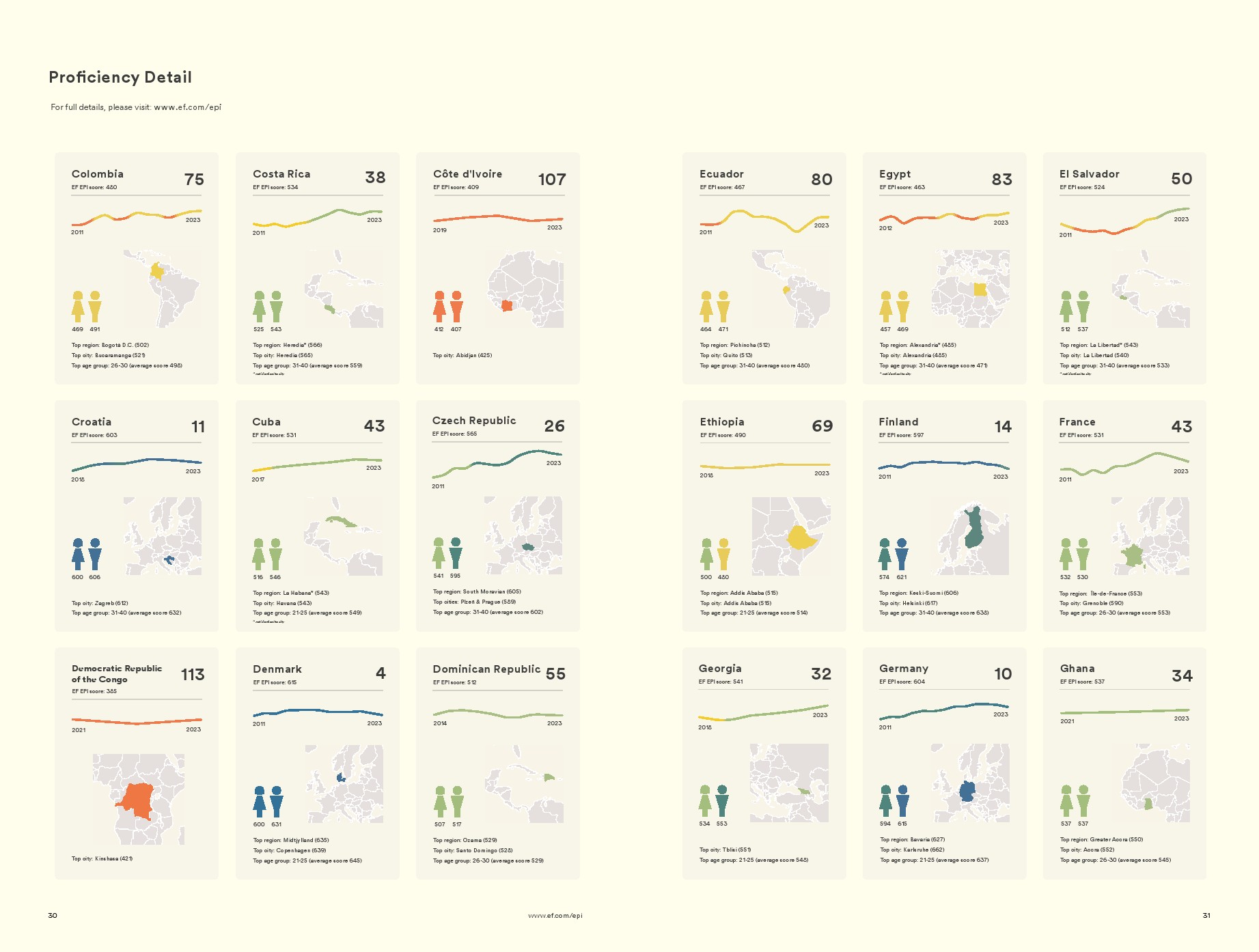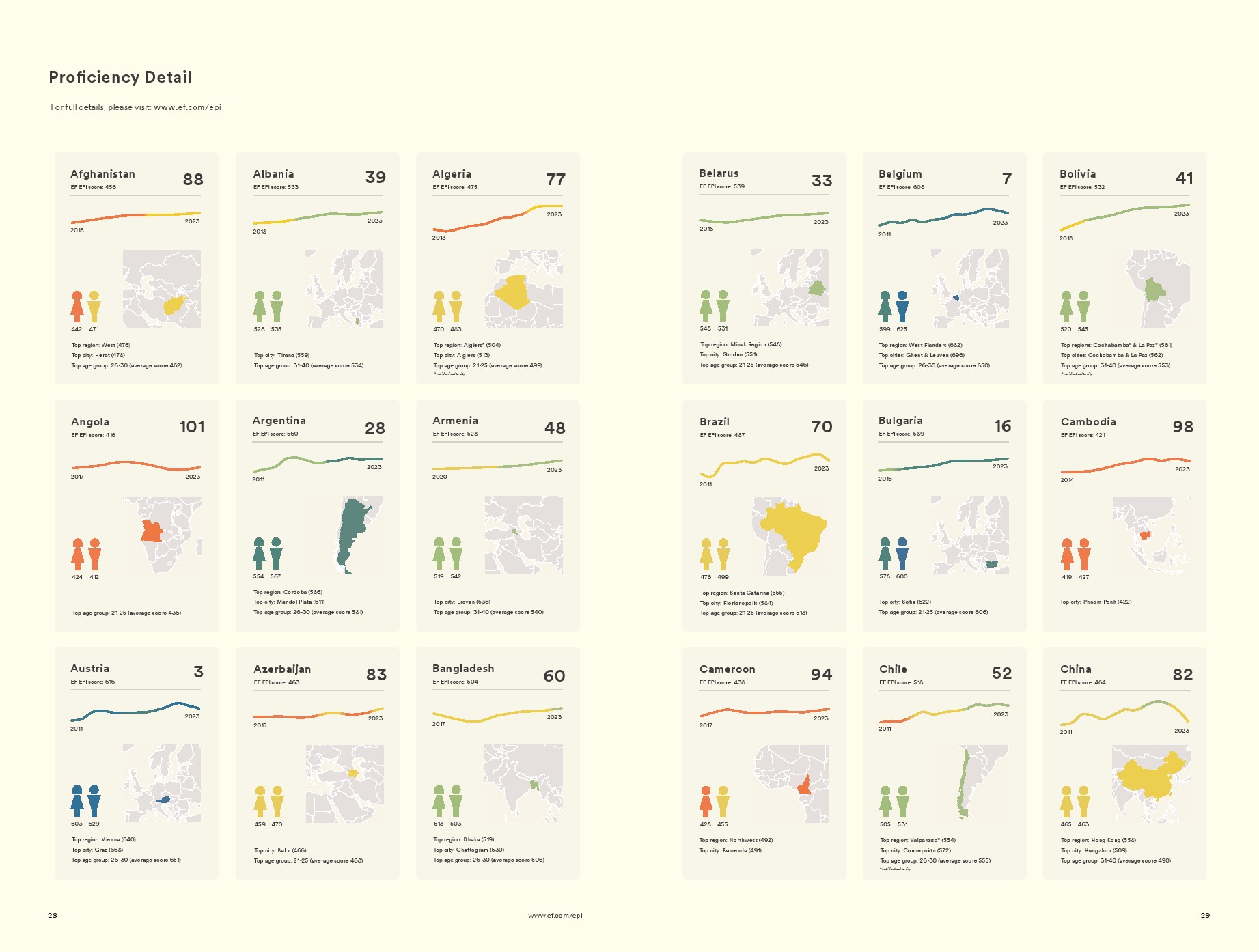 在一些地方,年轻人的英语水平正在下降。最年轻的年龄组(18-20岁)的英语水平正在下降。在这种情况下,看似世界范围的趋势实际上只是少数大国的趋势。在大多数地方,年轻人的英语熟练程度一直保持稳定。即使下降了,也与大流行期间教育系统的中断有关。目前尚不清楚COVID造成的学习损失是否会随着时间的推移而自我纠正,但预计会看到反弹。对于那些经历了较长时间最年轻群体下降的国家来说,挑战更大,因为这些国家的教育系统教授英语的水平不如以前。读者可以在EF EPI网站上查询不同年龄段的国家熟练程度趋势。