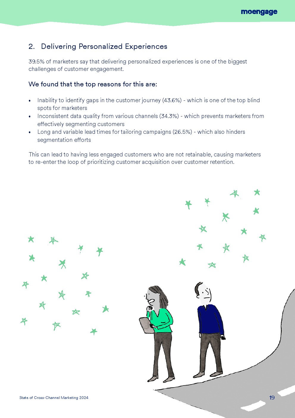 B2C营销人员面临的最大客户参与挑战是预算/资源限制(45.4%)和提供个性化体验(39.5%)。后者的首要原因是无法识别客户旅程中的差距。