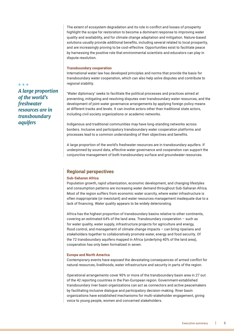报告指出,跨境水管理合作似乎是维护和平的有力工具。通过为各方定期对话创造条件并建立必要的法律框架,这种合作有可能解决大多数与水有关的争端,从而防止出现或加剧更大范围的冲突。