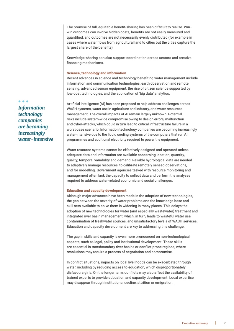报告指出,这两个例子凸显了一个事实:即便在复杂局势下,各国仍然能够通过国际合作及联合国体系的支持,制订并实施关于水资源利用和共享资源管理的公平且平等的政策。