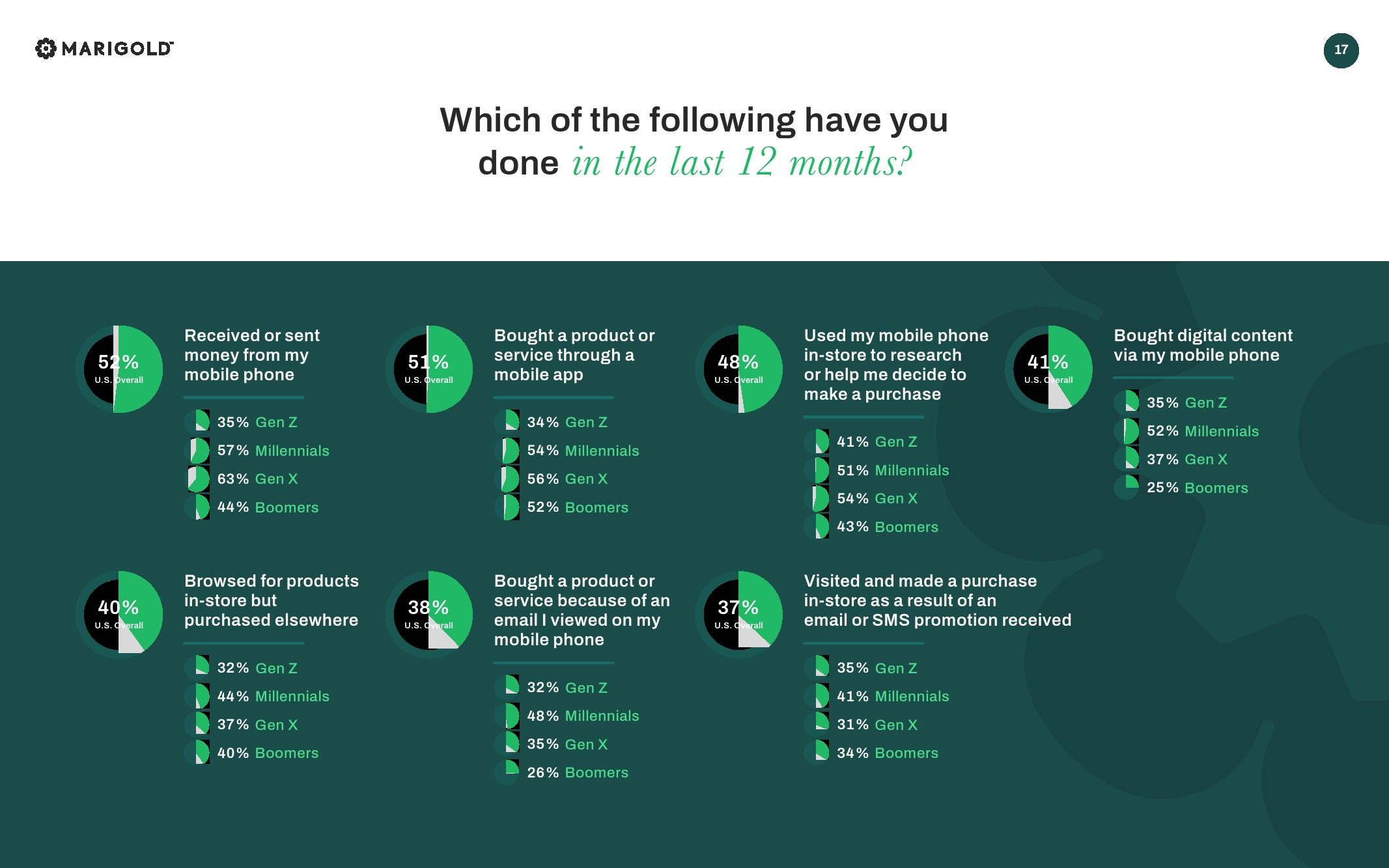 77%的Z世代和81%的千禧一代可能会参与与品牌目的相关的活动信息,而X世代和婴儿潮一代的这一比例分别为62%和53%。