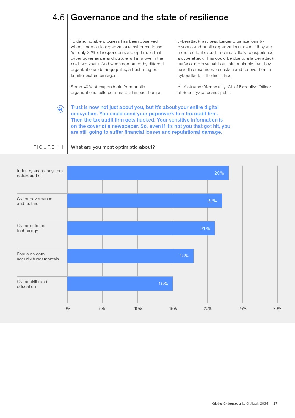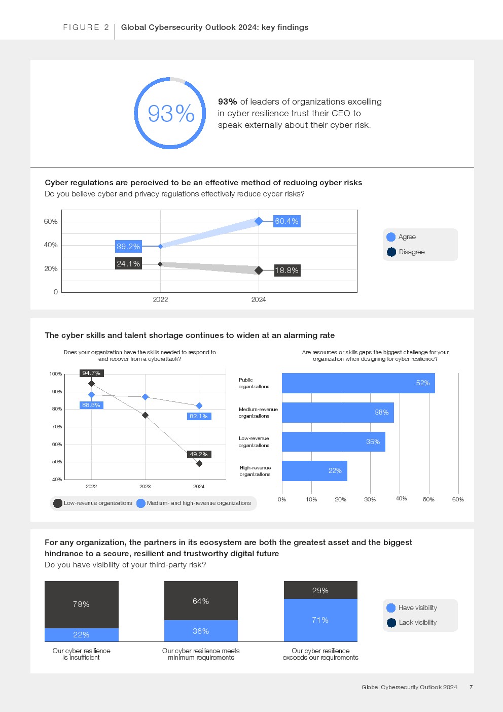 具有网络弹性的组织和那些正在挣扎的组织之间出现了明显的分歧。威胁形势的轮廓、宏观经济趋势、行业监管以及一些组织对范式转换技术的早期采用,加剧了网络公平方面的明显分歧。其他明显的障碍,包括获取创新网络服务、工具、技能和专业知识的成本不断上升,继续影响着全球生态系统在面对无数转型时建设更安全网络空间的能力。
