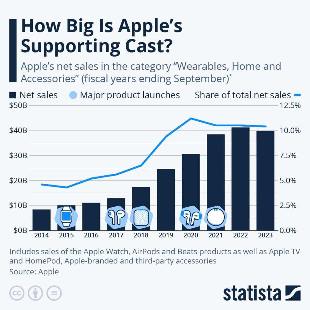 Apple Watch、AirPods、Apple TV、HomePods以及所有苹果品牌和第三方配件一起,归属于苹果公司的 “可穿戴设备、家居和配件”部门(以前称为”其他产品”),该部门在过去几年中增长迅速。特别是在Apple Watch和AirPods的成功推动下,该部门的销售额在过去十年中增长了四倍多,在截至2023年9月30日的财年中达到398亿美元。