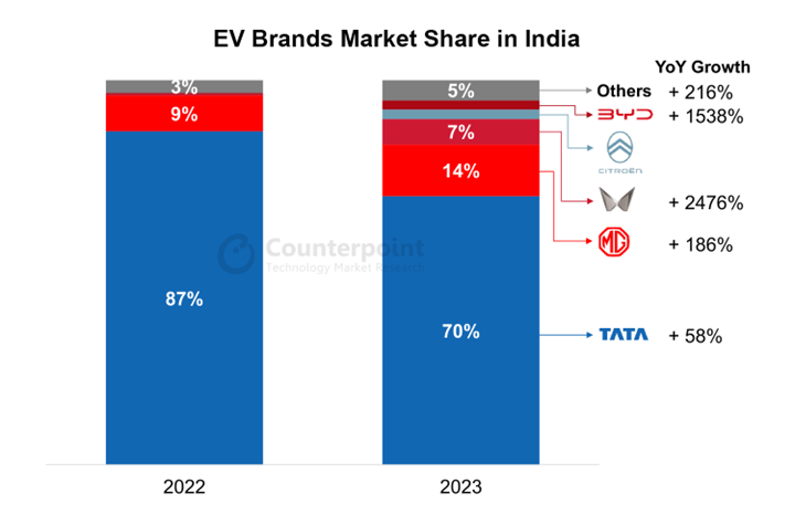 凭借强大的产品组合和与优步的战略合作,塔塔汽车在2023年占印度电动汽车市场逾2/3的份额,但部分份额被Mahindra & Mahindra和比亚迪夺走。Mahindra & Mahindra是2023年增长最快的品牌,仅一款车型就增长了2476%,其次是比亚迪和MG汽车。