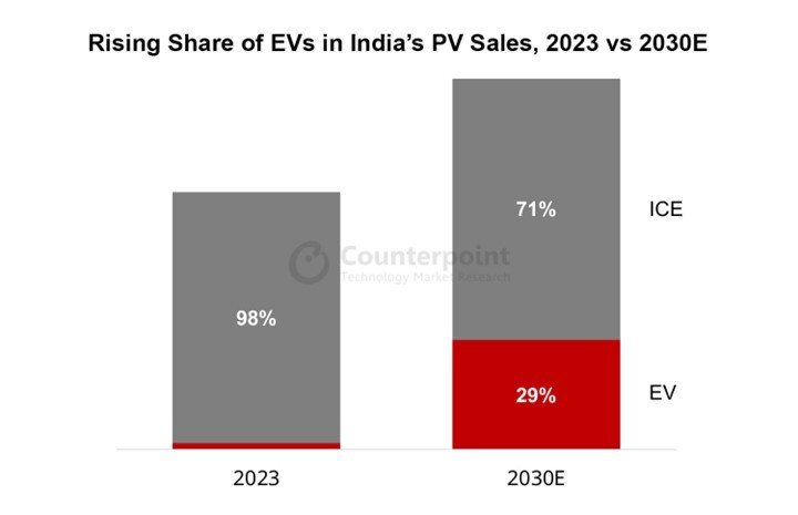 根据Counterpoint印度乘用车车型销售跟踪,预计2024年印度的电动汽车销量将增长66%,占汽车总销量的4%。展望2030年,电动汽车预计将占印度汽车销量的近1/3。