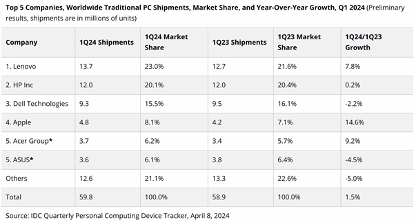 根据IDC的最新报告,全球传统个人电脑市场在经历了两年的下滑后,于2024年第一季度恢复增长。该季度全球PC出货量达到5980万台,同比增长1.5%。