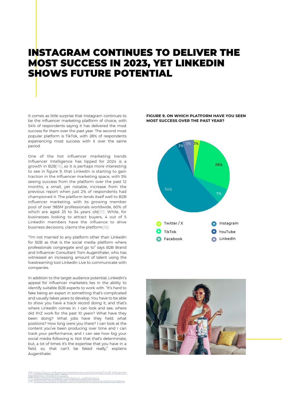 2023年,Instagram仍然是网红营销的首选平台,54%的受访者表示Instagram为他们带来了最大的成功。相比之下,28%的受访者认为TikTok最成功。2024年,TikTok似乎将超过Instagram, 44%的受访者计划今年投资TikTok。