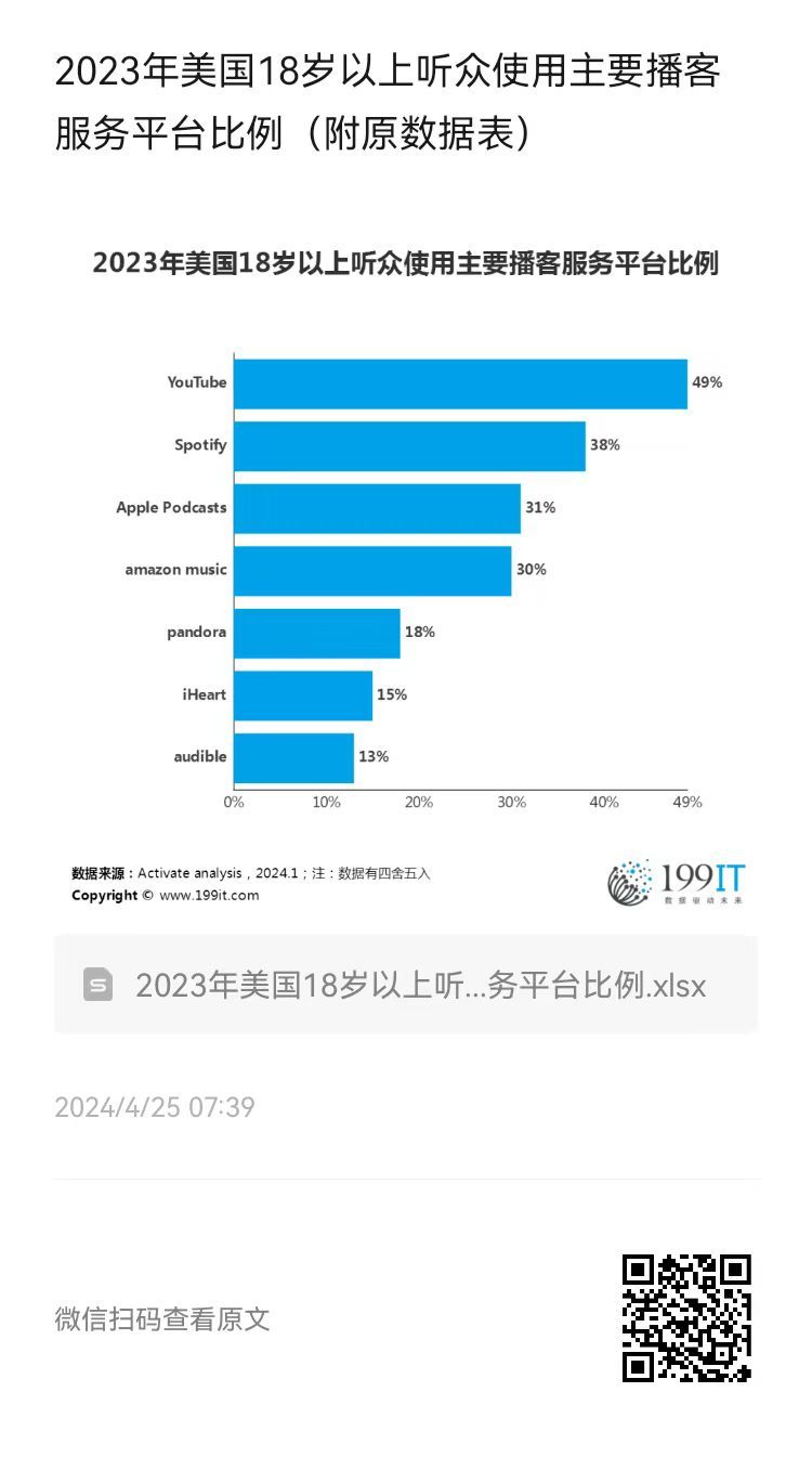 2023年美国18岁以上听众使用主要播客服务平台比例(附原数据表) ​​​