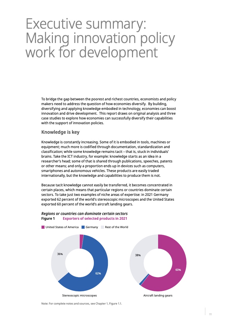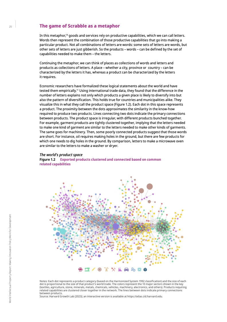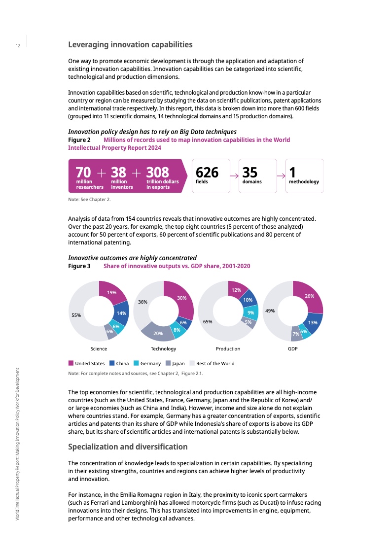 报告发现,各国往往利用现有的创新能力作为多样化的跳板。为了进一步分析基于科学、技术和生产技术诀窍的创新能力,报告分别研究了科学出版物、专利申请和国际贸易方面的数据,发现创新成果高度集中。例如,在过去20年里,排名前八位的国家(占所分析国家的5%)占出口额的50%、科学出版物的60%和国际专利授予量的80%。