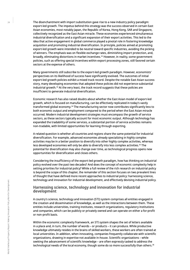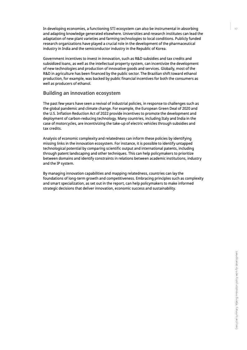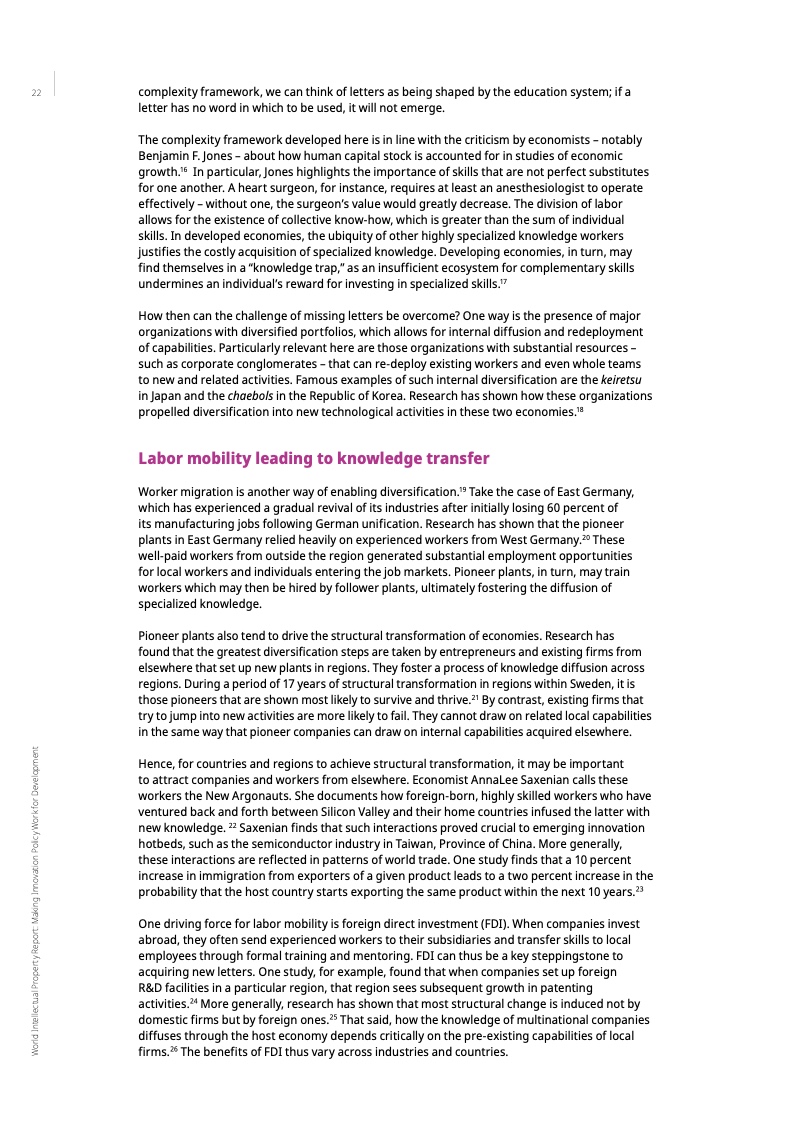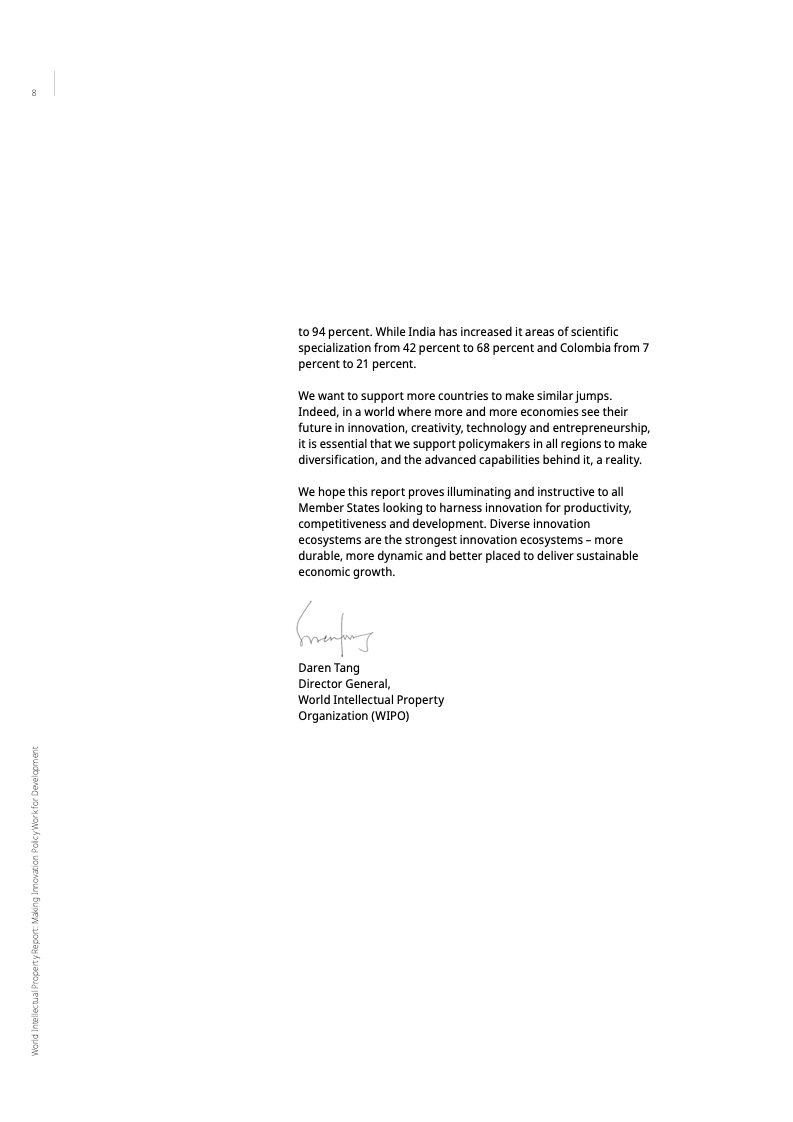 报告发现,各国往往利用现有的创新能力作为多样化的跳板。为了进一步分析基于科学、技术和生产技术诀窍的创新能力,报告分别研究了科学出版物、专利申请和国际贸易方面的数据,发现创新成果高度集中。例如,在过去20年里,排名前八位的国家(占所分析国家的5%)占出口额的50%、科学出版物的60%和国际专利授予量的80%。