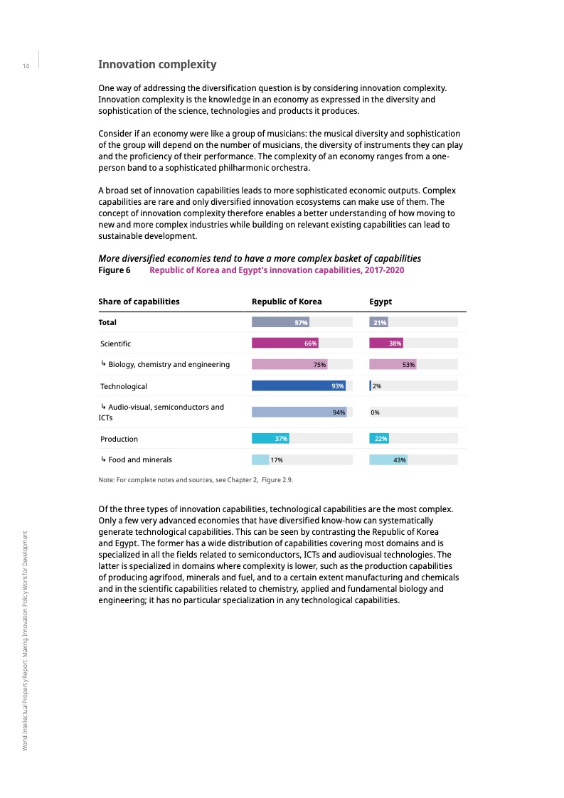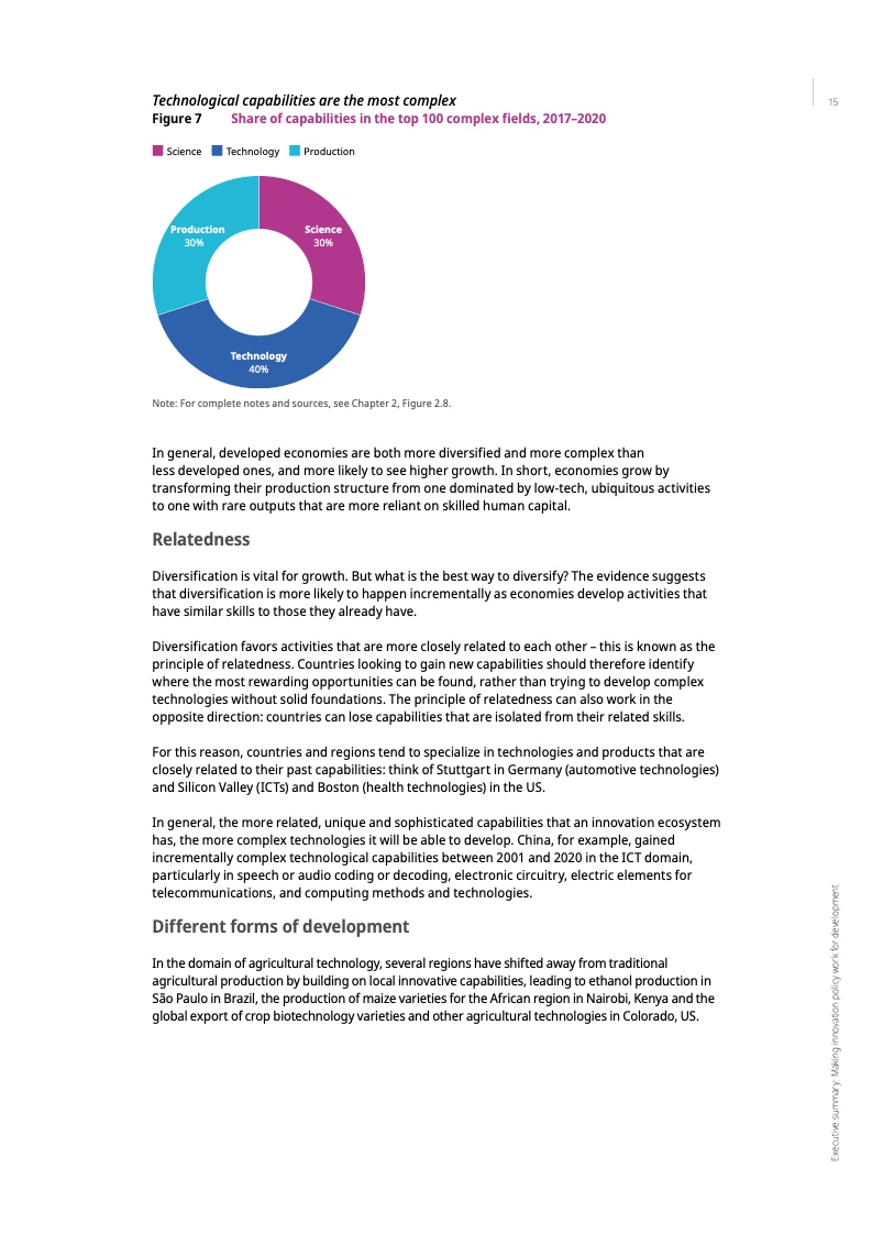 报告还探究了创新复杂性,即一个经济体的科学、技术和产品所表现的多样性和复杂性知识。复杂的能力很罕见,只有多样化的创新生态系统才能利用它们。在三种创新能力中,技术能力最为复杂,也更有可能带来更高的增长。