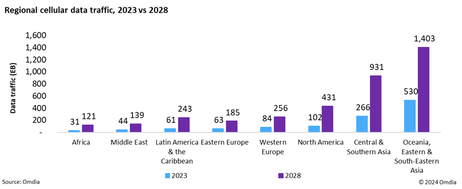 Omdia 预计,未来五年蜂窝数据流量将增至原本的三倍以上,这得益于更快的 5G 迁移速度——到 2028 年,全球 5G 移动和 FWA 服务的总体渗透率将达到 52%。