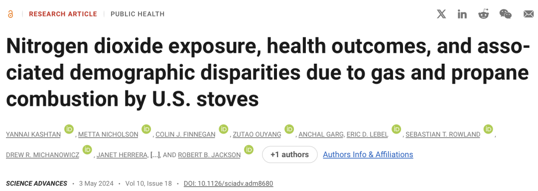 [1]Kashtan Y, Nicholson M, Finnegan CJ, Ouyang Z, Garg A, Lebel ED, Rowland ST, Michanowicz DR, Herrera J, Nadeau KC, Jackson RB. Nitrogen dioxide exposure, health outcomes, and associated demographic disparities due to gas and propane combustion by U.S. stoves. Sci Adv. 2024 May 3;10(18):eadm8680. doi: 10.1126/sciadv.adm8680. Epub 2024 May 3. PMID: 38701214; PMCID: PMC11068006.