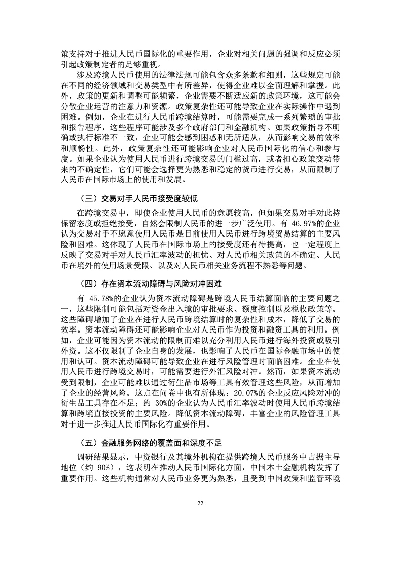 在企业层面,跨境人民币结算的动机呈现多样性,主要有资产安全性、风 险配置、现金管理和更高收益等。然而,企业在使用人民币进行跨境结算时也 面临一系列困难和障碍,如政策复杂性、资本流动限制、风险对冲工具不足 等。企业普遍期望出台强有力的跨境人民币支持政策。