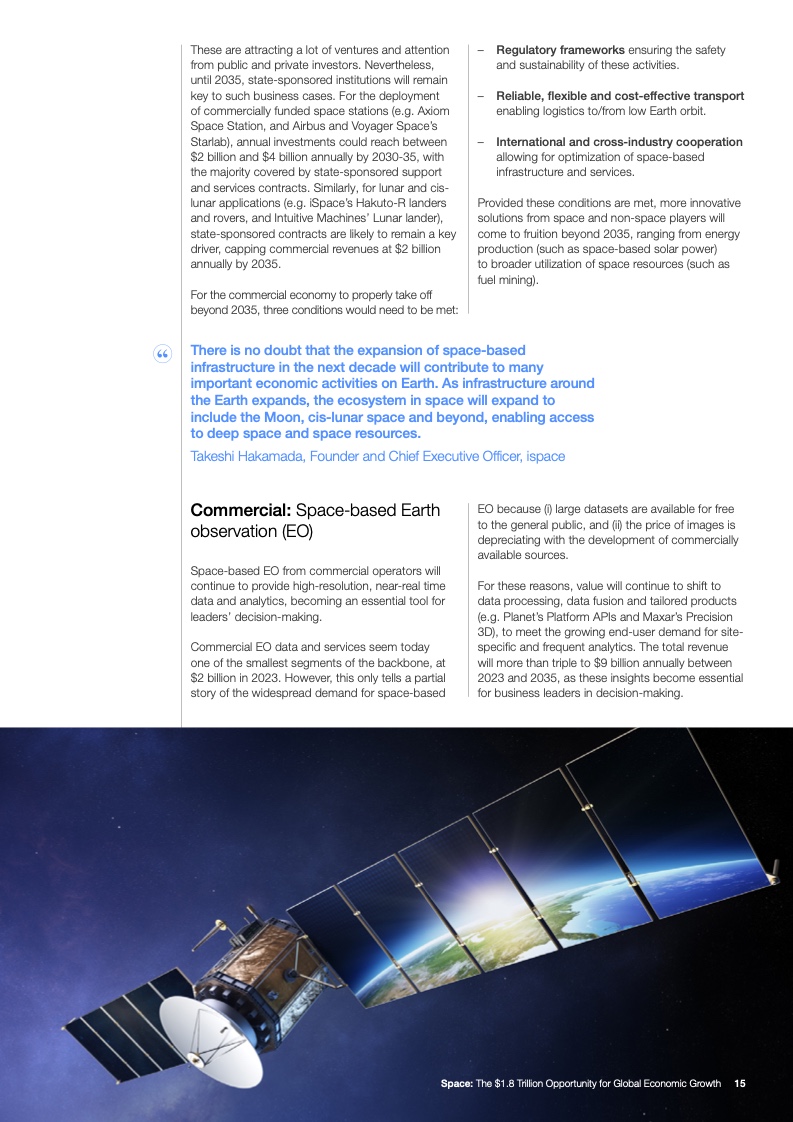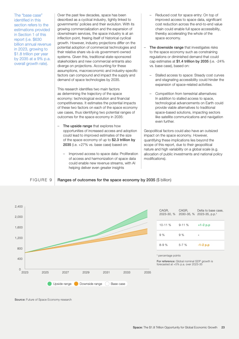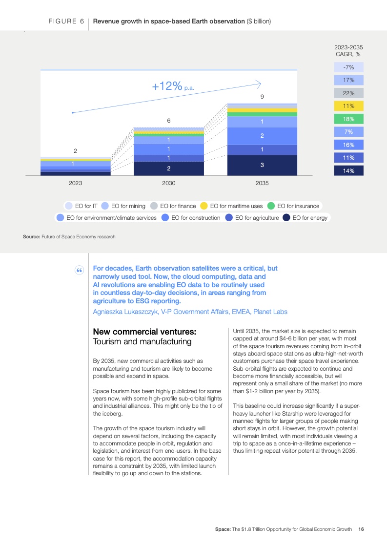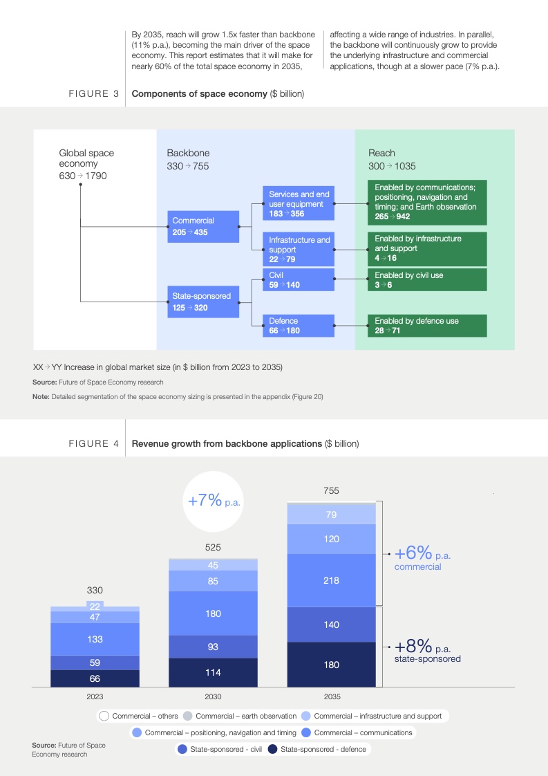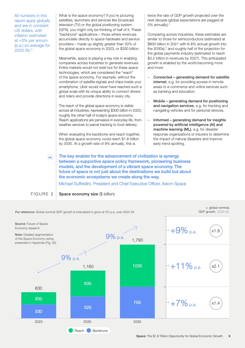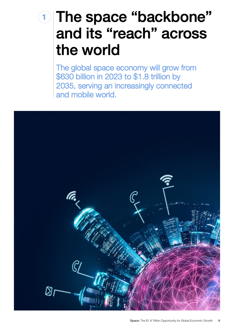太空经济预计将从2023年的6300亿美元增长到2035年的1.8万亿美元,年均增长率达9%,显著高于全球GDP的增长速度。通信、定位、导航和定时以及地球观测(EO)服务等太空技术将是太空经济增长的主要动力。