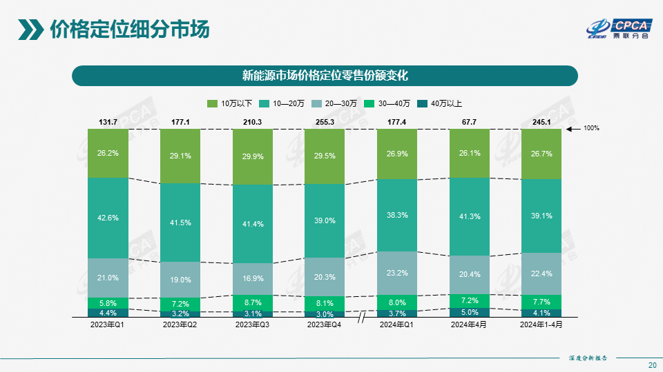 乘联会:2024年4月份全国新能源市场深度分析报告 本文为中国汽车流通协会乘用车市场信息联席分会发布的权威深度市场分析报告,涵盖了: 一、总市场 二、技术类型细分市场 三、车型大类细分市场 四、品牌定位细分市场 五、国别定位细分市场 六、价格定位细分市场 七、企业竞争 更多阅读:乘联会:2022年6月份全国新能源市场深度分析报告乘联会:2022年10月份全国新能源市场深度分析报告乘联会:2023年4月份全国新能源市场深度分析报告乘联会:2023年7月份全国新能源市场深度分析报告中国汽车流通协会:2022年12月份全国新能源市场深度分析报告中国汽车流通协会:2023年5月份全国新能源市场深度分析报告中国汽车流通协会:2023年9月份全国新能源市场深度分析报告懂车帝:新能源与燃油车用户消费行为洞察报告英国商品研究所:中国占全球新能源汽车销量的40%以上乘联会:2022年7月份全国新能源市场深度分析报告TrendForce:2023年第一季全球新能源汽车销量达265.6万辆中国汽车流通协会:2020年上半年新能源专用车分析乘联会:2023年1月份全国新能源市场深度分析报告乘联会:2023年2月份全国新能源市场深度分析报告中国汽车流通协会:2022年中国占世界新能源车份额63%