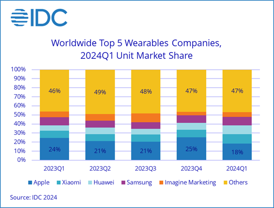 三星跌至第四位。Galaxy Fit 3的推出以及低价可听设备的成功,帮助该公司实现了市场领先的增长,尽管其核心智能手表的销量在本季度下降了5.1%。