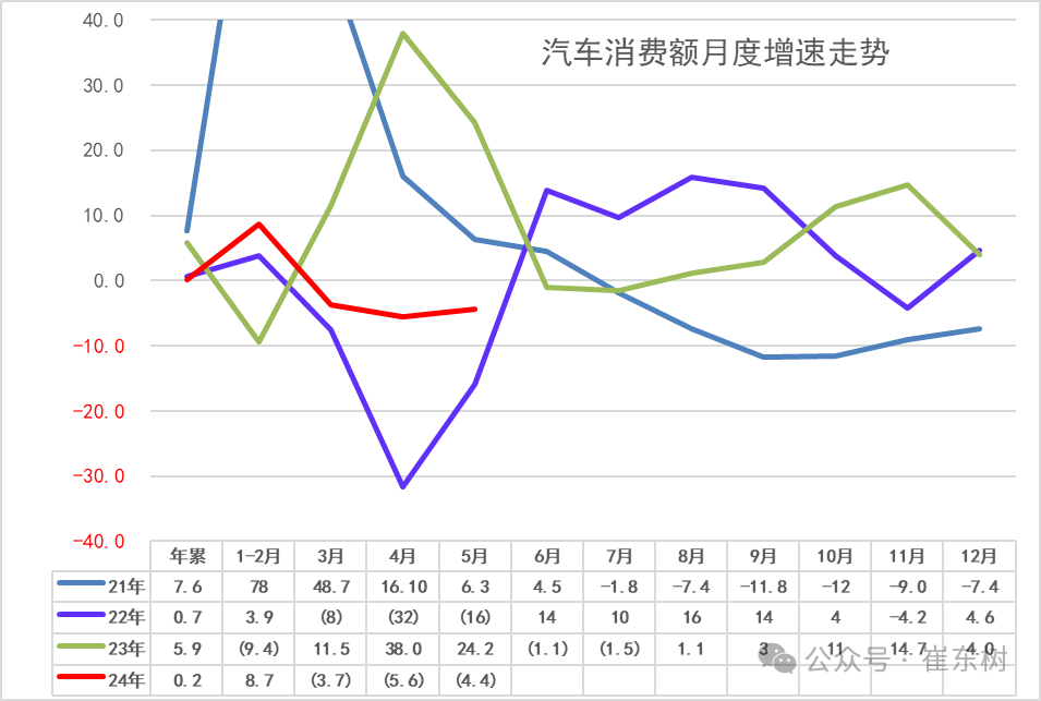 2023年的开局较弱, 因此2024年1-5月的汽车消费实现0.2%的增长。