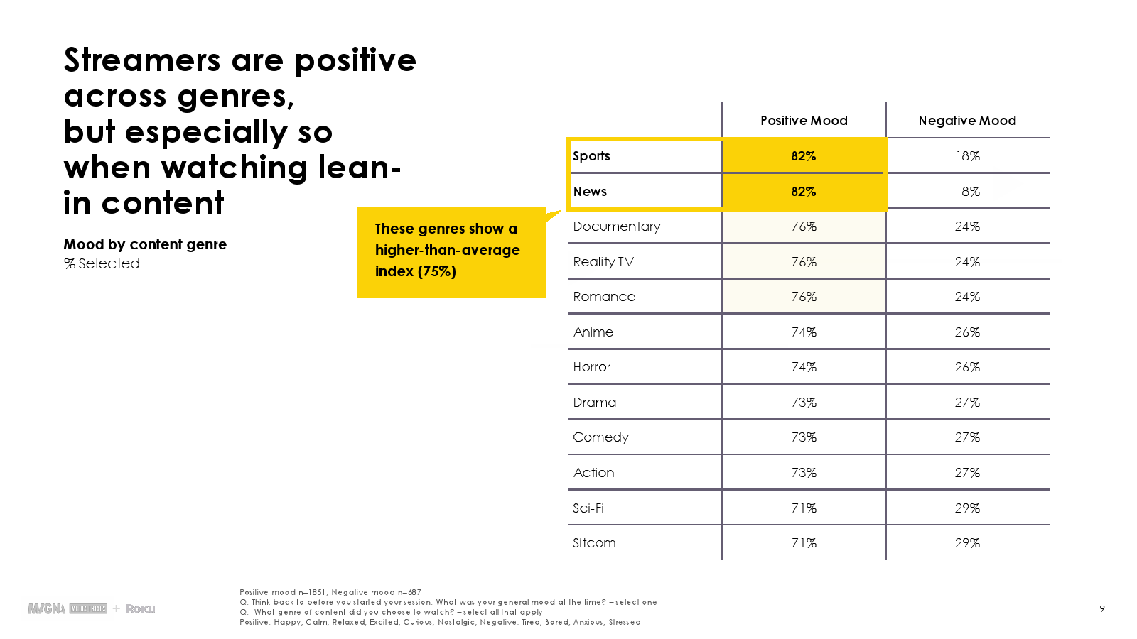 新闻(82%)和体育(82%)都是流媒体用户在心情良好时访问的内容类型:这两种内容类型都高于75%的平均水平。