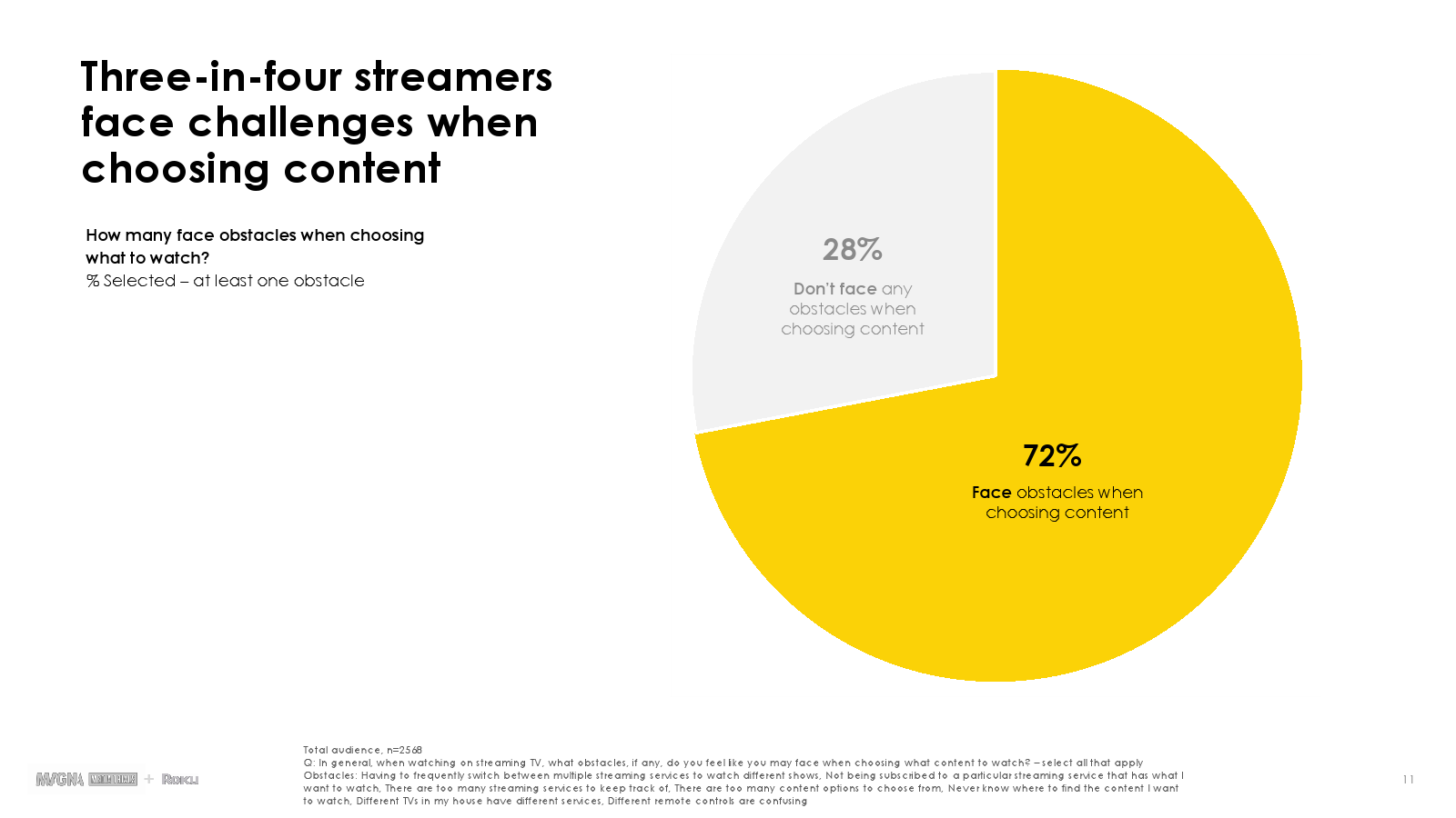 报告显示,3/4的流媒体用户在选择内容时面临挑战,而电视流媒体平台的分散增加了他们选择内容的复杂性。