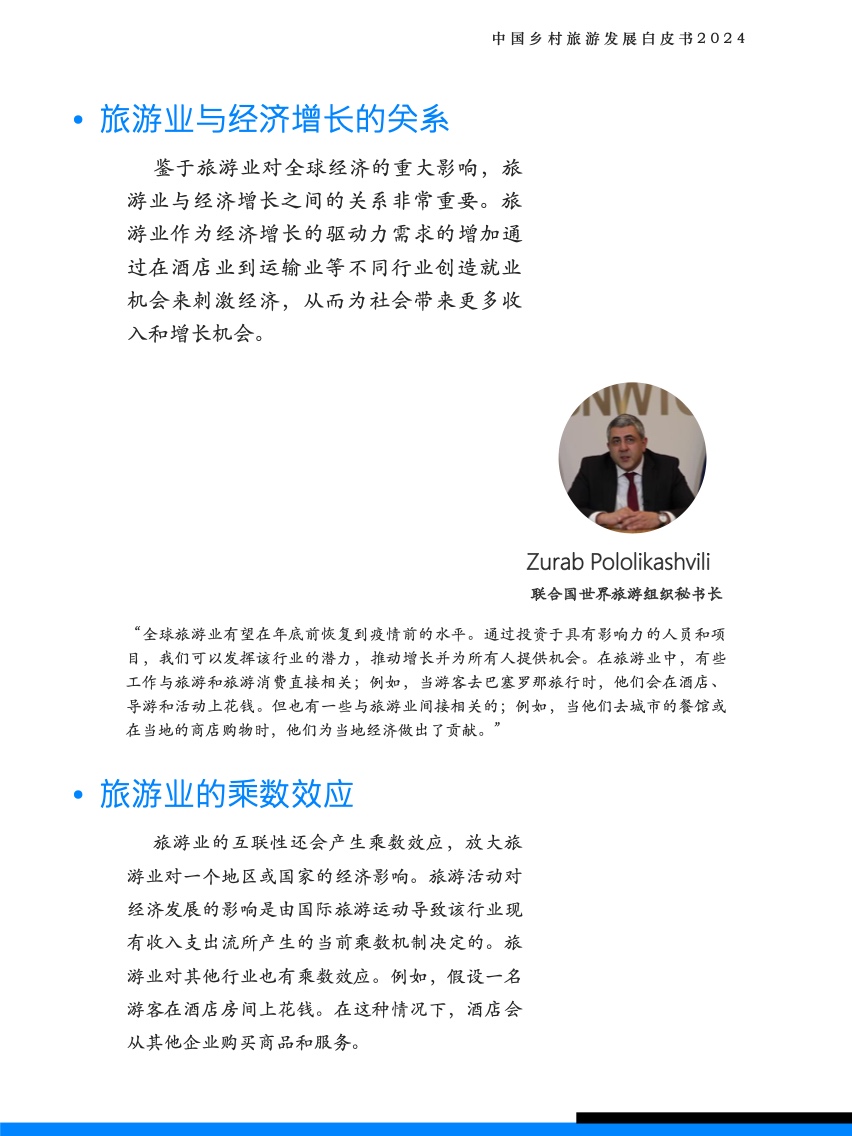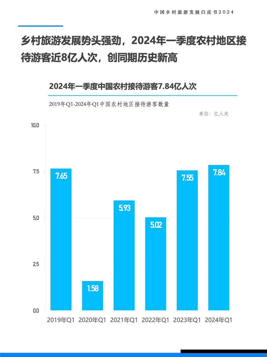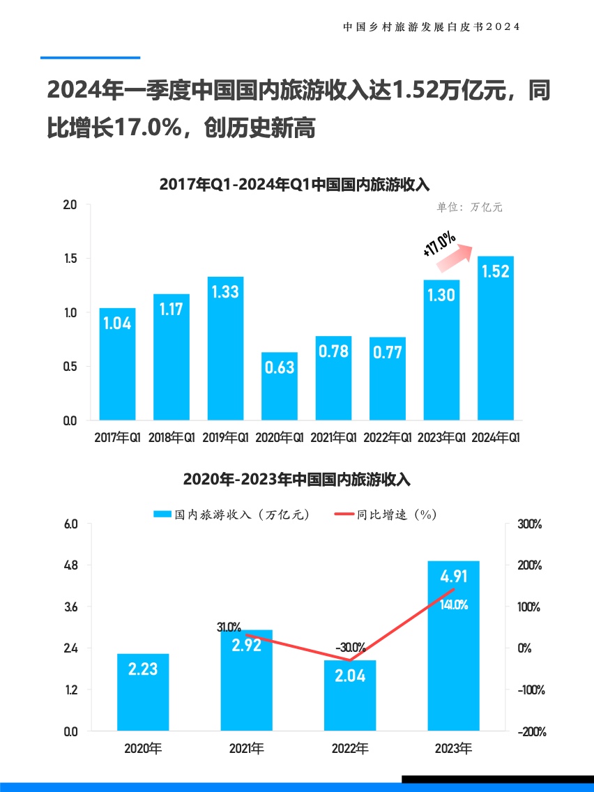 2019年中国国内旅游收入占到全国GDP的5.8%,在大流行期间旅游业在经济活动中的重要性大幅下降,2022年国内旅游收入仅占GDP的1.7%,但好消息是旅游业正在快速收复失地,2024年一季度,旅游业占GDP的比重已经恢复到了5.1%。旅游业对经济的影响不仅限于创造了GDP,它还提供了工作岗位、充当了经济增长引擎的作用、刺激了基础设施投资、促进可持续发展、并促进文化和自然遗产的保护,这种多方面的影响表明旅游业对中国城乡经济发展至关重要。