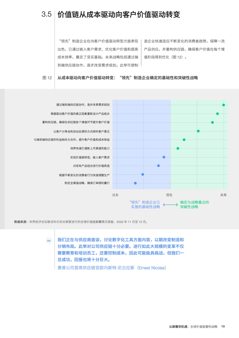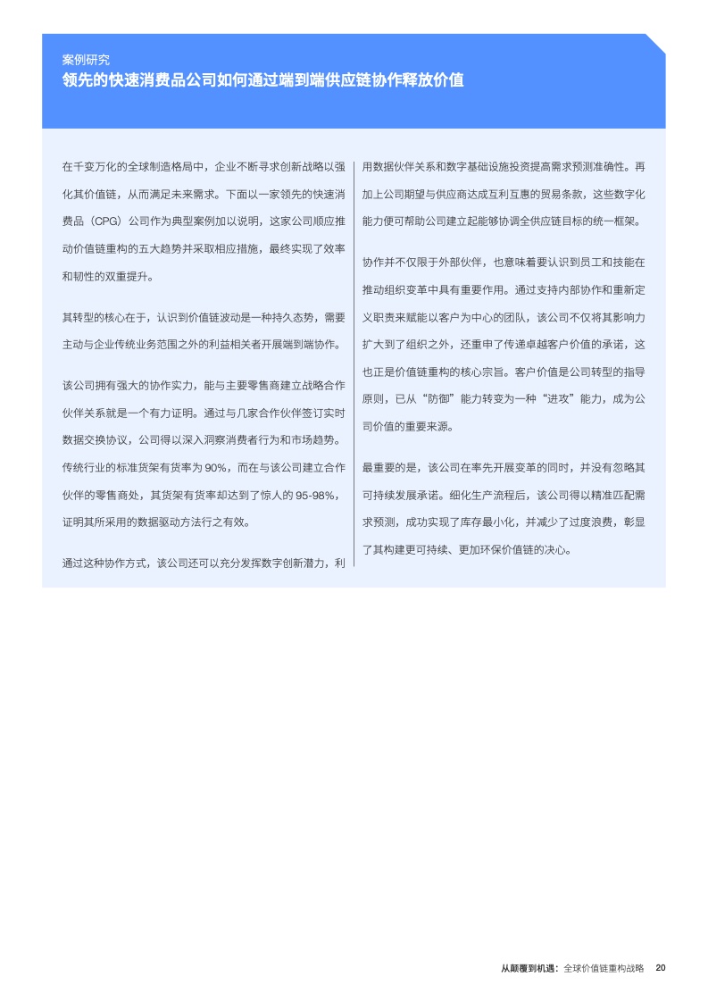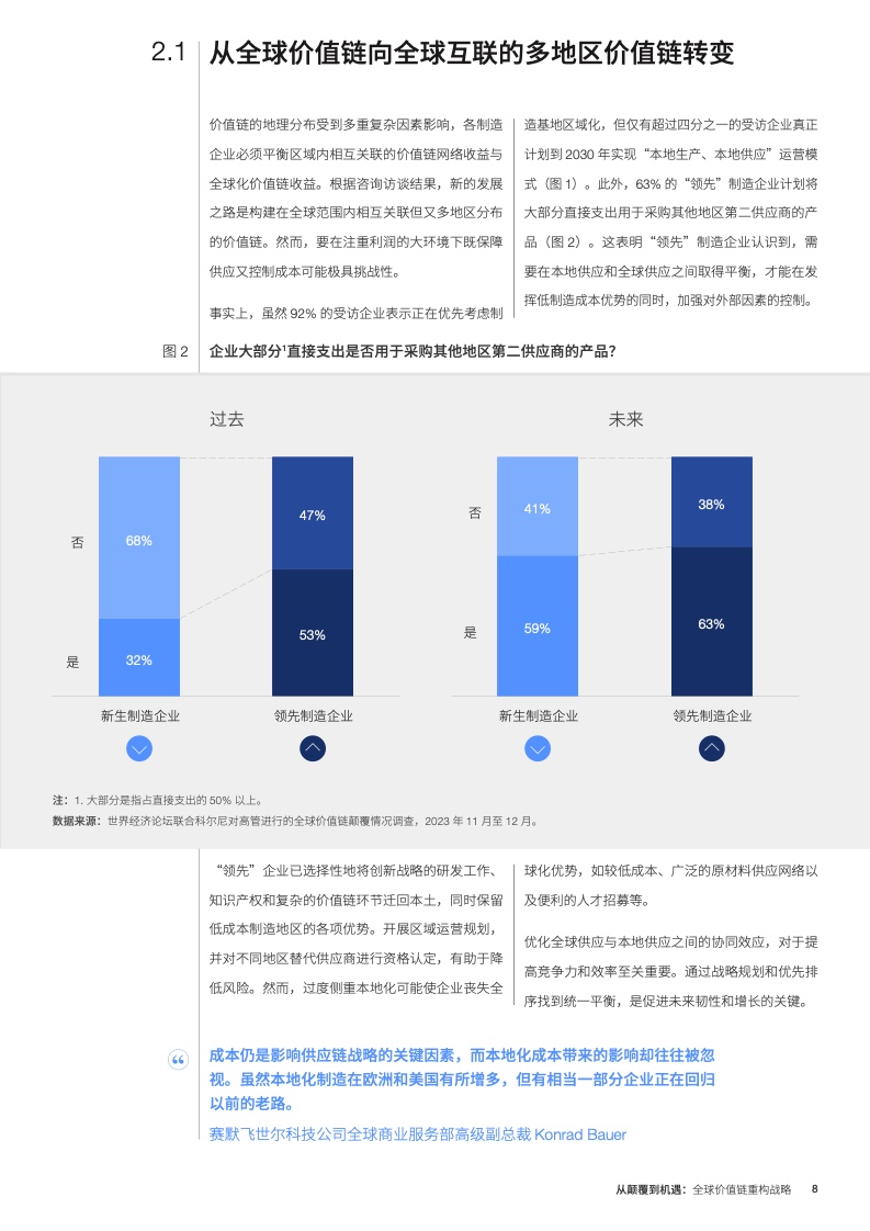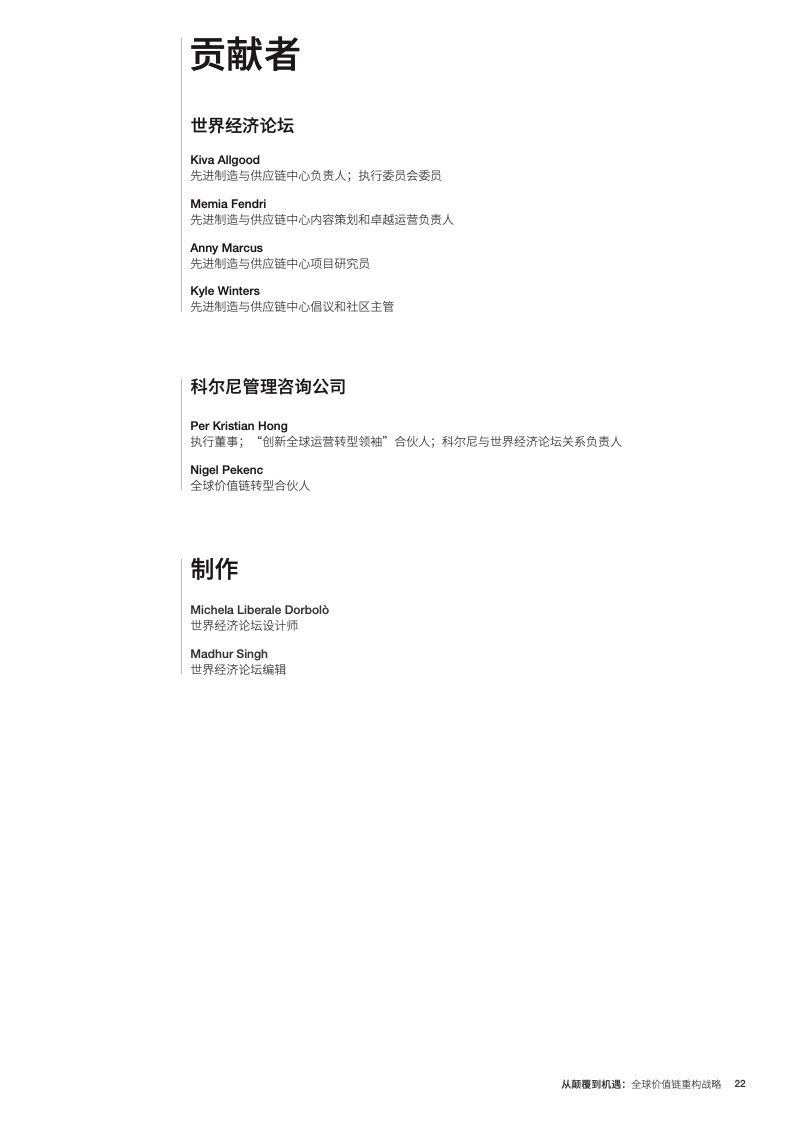 有鉴于此,世界经济论坛联合科尔尼对300 多位全 球运营高管进行了调查,并在之后开展了 30 多次 咨询访谈,以了解制造业和供应链参与者正在采取 哪些措施重新设计其价值链。