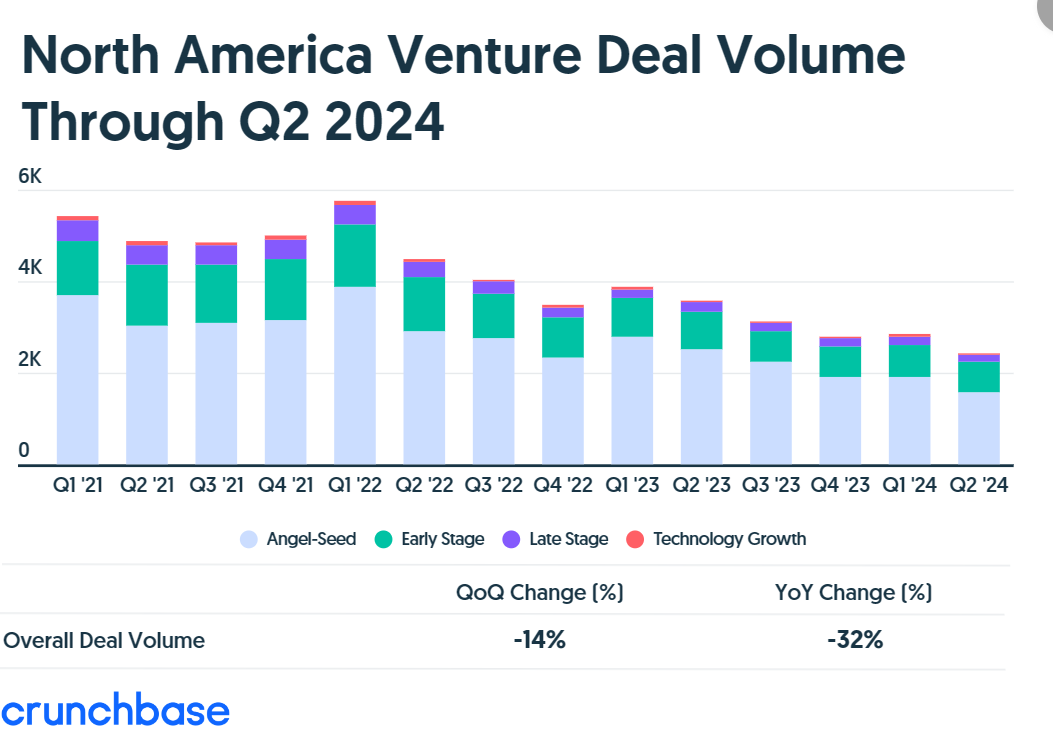 总体而言,投资者在2024年第二季度向美国和加拿大初创公司的种子期到成长期投资了453亿美元。这比上一季度增长了30%,比去年同期增长了35%。