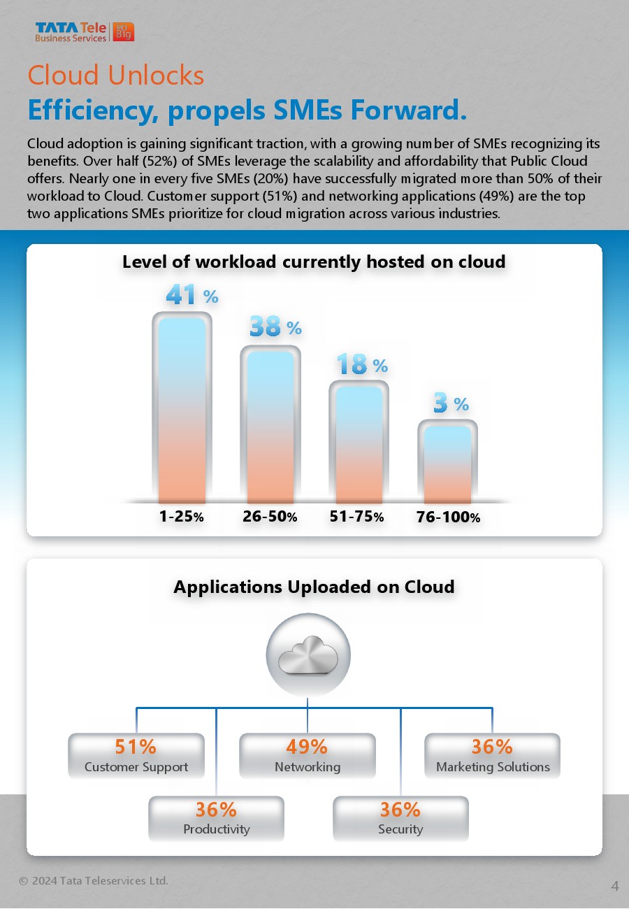 印度中小企业越来越多地利用云来提高效率、弹性和灵活性。云计算为中小企业实现快速业务增长和提供更好的客户体验提供了基础。在2024财年,高达50%的中小企业利用云计算实现业务增长。48%的受访者优先考虑云来增强客户体验;38%的受访者加快企业范围内转型的步伐。