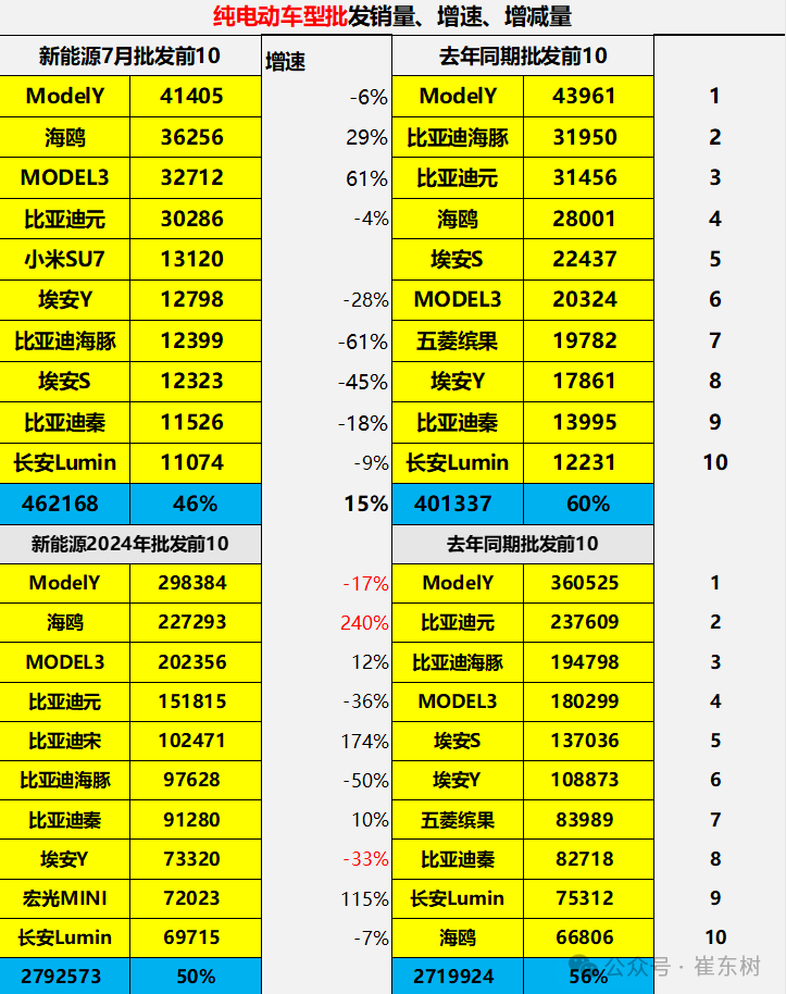 根据乘联会数据,2024年7月新能源乘用车批发销量达到94万辆,同比增长28%。7月新能源批发结构中:纯电动53%、狭义插混34%、增程式13%。乘联会秘书长崔东树公布了纯电动车型批发销量TOP10:特斯拉Model Y、比亚迪海鸥、特斯拉Model 3、比亚迪元、小米SU7、埃安Y、比亚迪海豚、埃安S、比亚迪秦、长安Lumin。