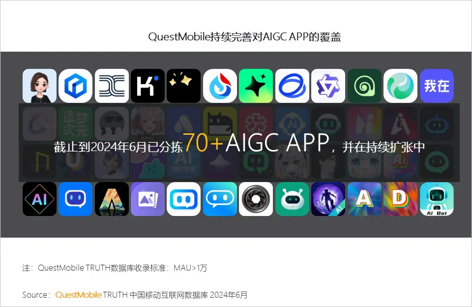 如果说2023年是大模型元年,那么2024 年则是AI应用元年,行业迎来爆发式增长 ,各类应用陆续推向市场。据QuestMobile《2024上半年AIGCAPP流量与场景研究报告》数据显示,截至2024年6月AIGCAPP MAU大于1万的AIGC APP已经分拣70+,并在持续扩张中。截至今年5月,国内已经推出超过300个大模型。其中,10亿参数规模以上的大模型已超100个。