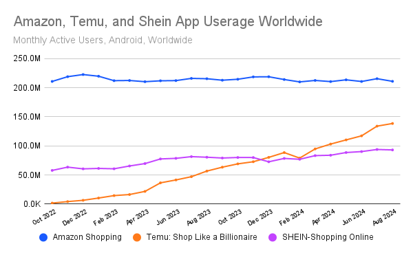Statista 和 AppMagic 的数据还显示,Temu 购物应用在 2023 年的下载量达到 3.37 亿次,比亚马逊的应用高出近 80%。