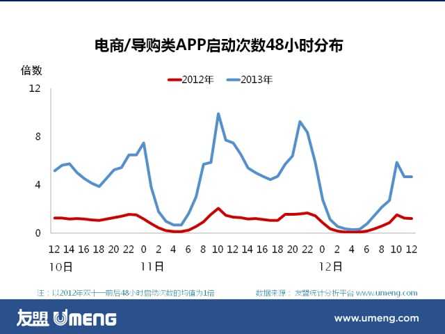 首先,从总量上看,2013年11月10日12点至12日12点的48个小时,电商/导购类应用的启动次数比2012年同期增长3.1倍。然后,观察11月11日0点前后的几个小时,我们可以发现以下有趣的现象: