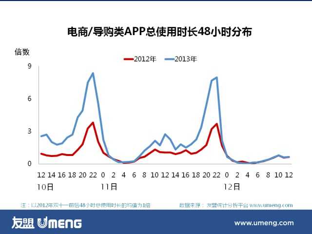 电商/导购类应用的用户行为,受到“双十一”的影响十分明显。以新增用户数量为例,2013年“双十一”前10天,电商/导购类APP日新增用户平均为2012年同期日新增的2.8倍。