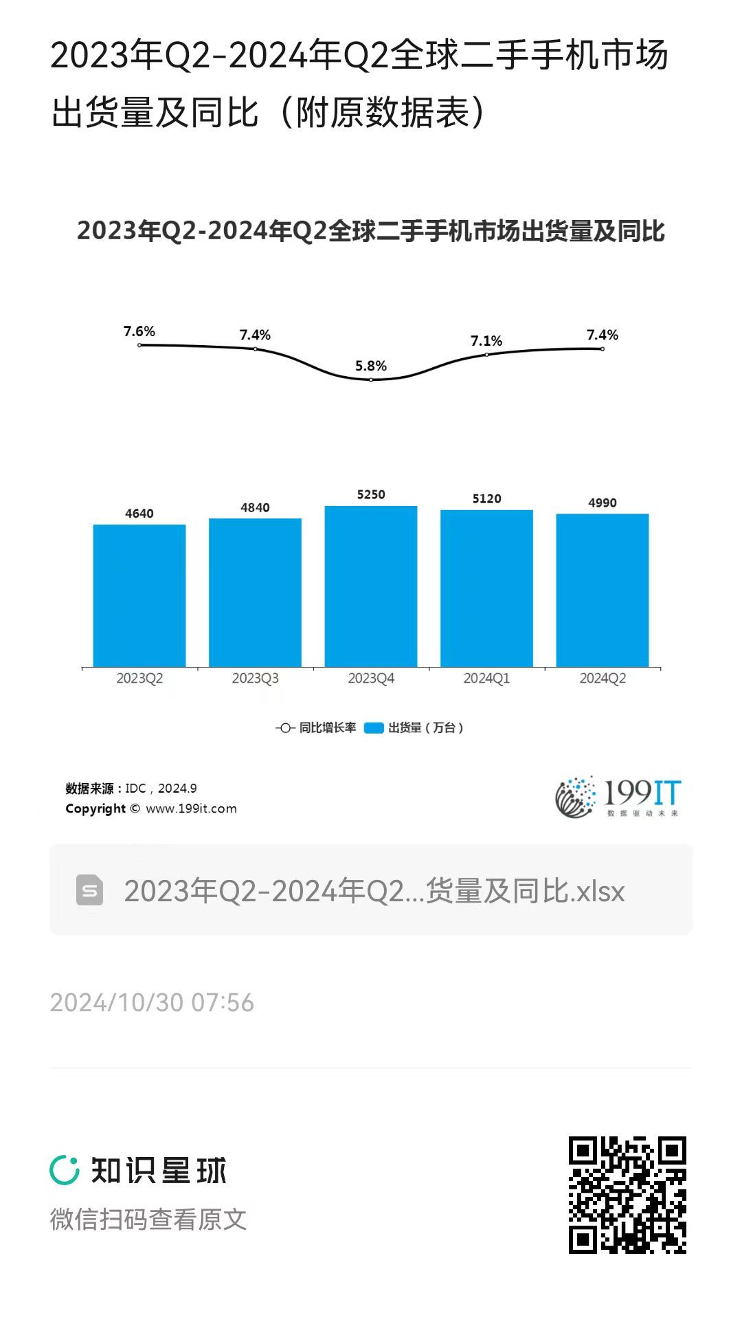 2023年Q2-2024年Q2全球二手手机市场出货量及同比(附原数据表) ​​​