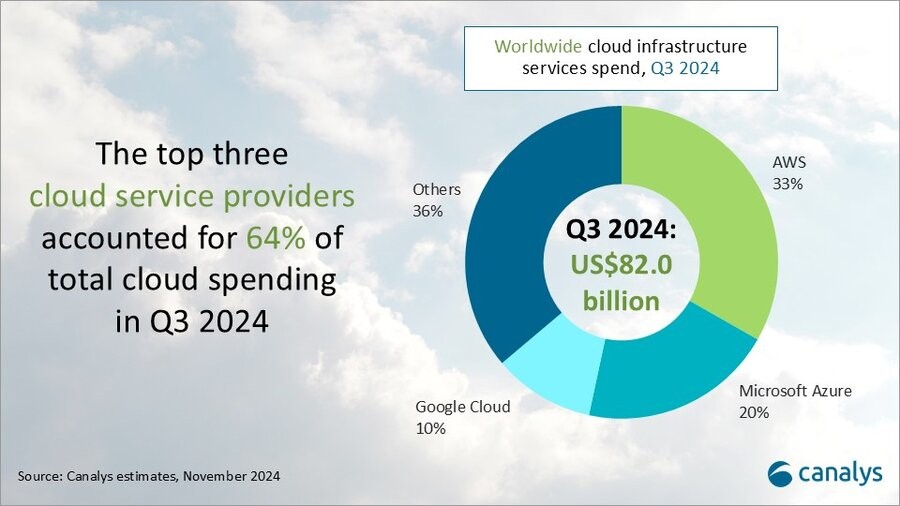 2024年第三季度,全球云基础设施服务支出同比增长21%,达到820亿美元。客户对超大规模企业人工智能产品的投资推动了增长,促使领先的云供应商加大对人工智能的投资。前三大云供应商(AWS、微软Azure和谷歌cloud)的排名与上一季度相比保持稳定,这些供应商合计占总支出的64%。这三家供应商的总支出同比增长了26%,并且都实现了连续增长。市场领导者AWS保持了19%的同比增长率,与上一季度保持一致。但微软(Microsoft Azure)和谷歌(Google Cloud)分别以33%和36%的增长速度超过了它。以实际美元计算,AWS的增长速度超过了微软和谷歌云,比去年增加了近44亿美元的销售额。
