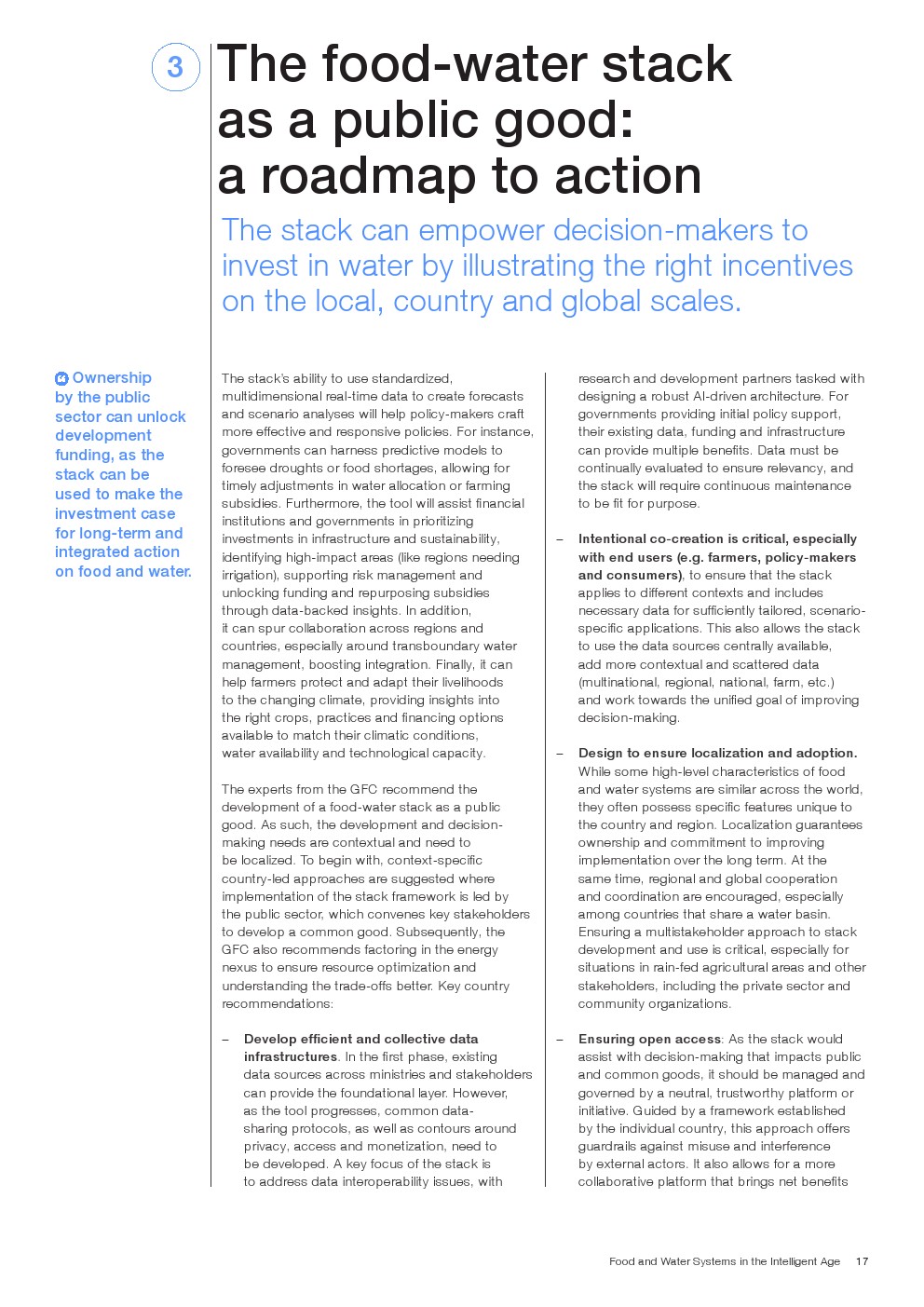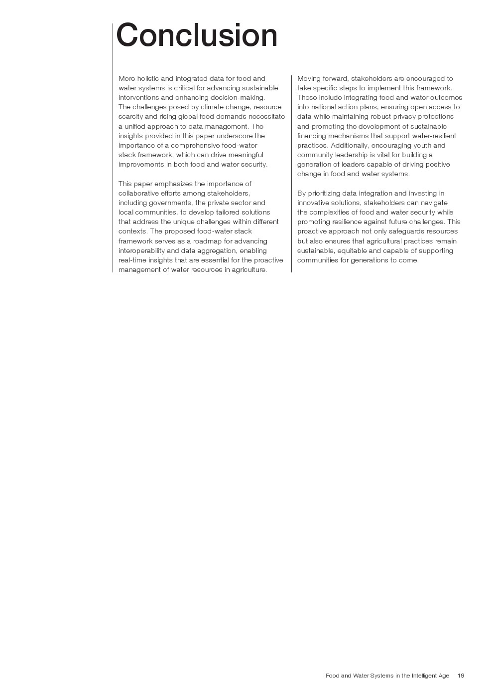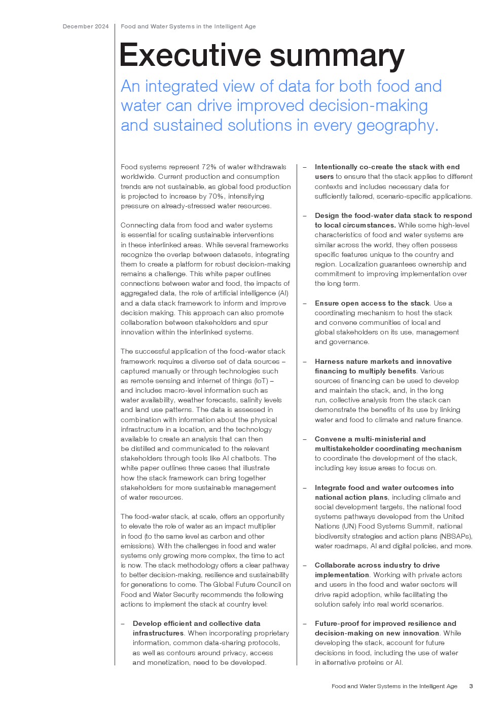 从规模上看,食物-水叠加提供了一个机会,将水作为食物的影响倍增器的作用提升到与碳和其他排放相同的水平。随着粮食和水系统面临的挑战越来越复杂,现在是采取行动的时候了。堆栈方法为子孙后代提供了更好的决策、弹性和可持续性的明确途径。全球未来粮食和水安全理事会建议采取以下行动,在国家一级实施这些措施: