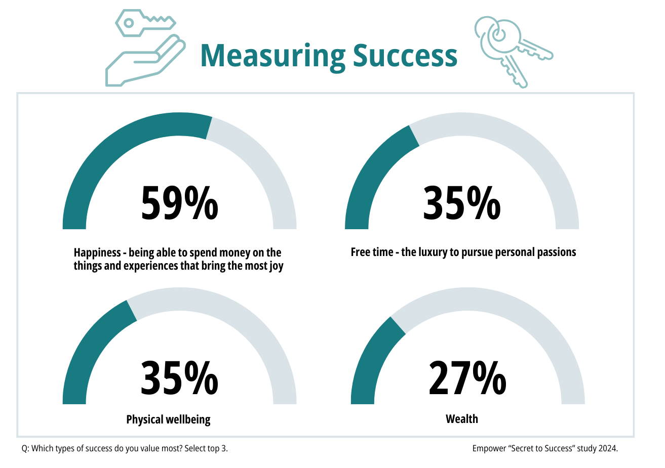 但这不仅仅是钱的问题,而是钱能买到的东西。只有27%的人认为财富是衡量财务成功的最高标准。相反,大多数美国人认为幸福(59%)是最重要的基准。