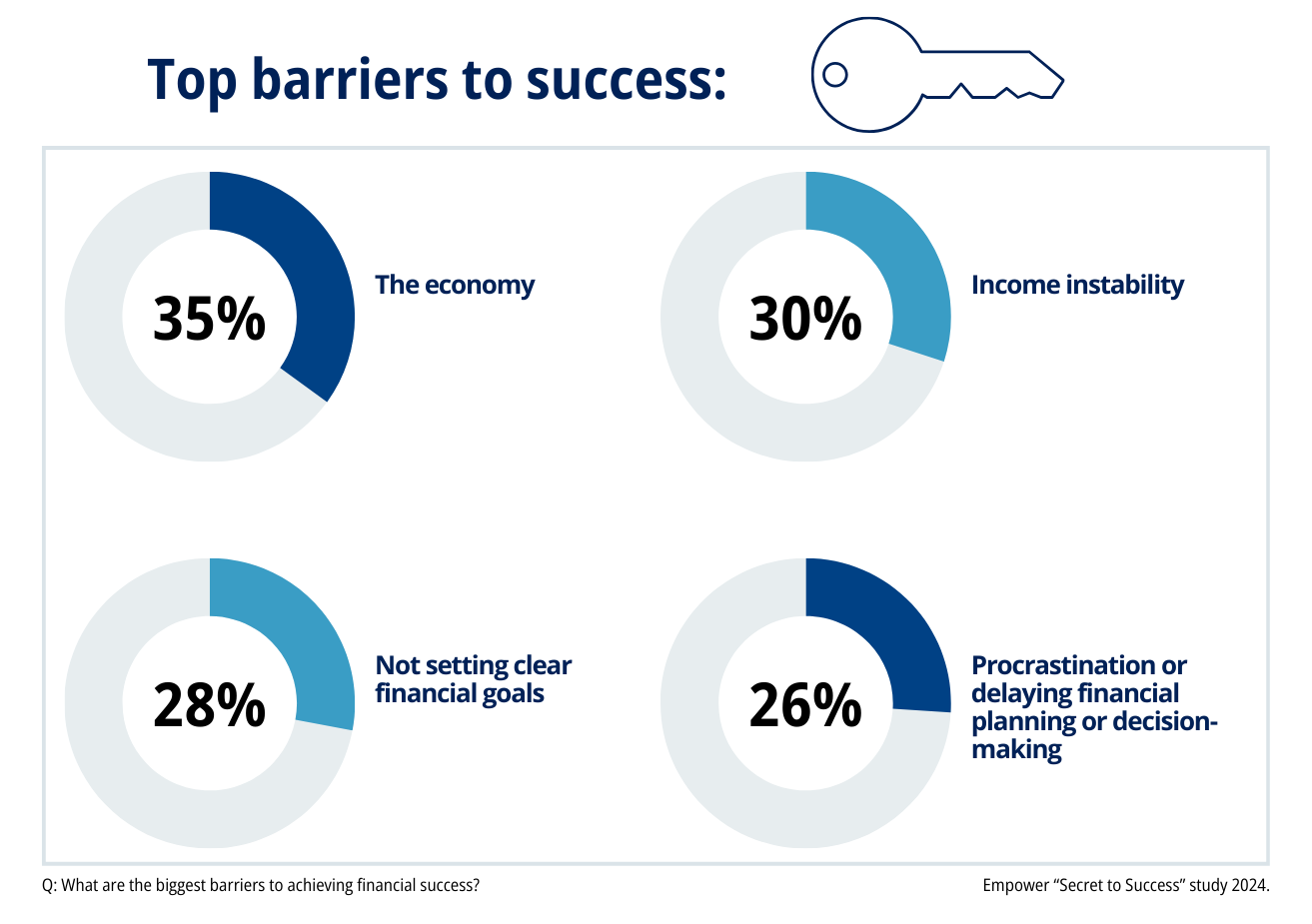 超过1/3的人认为经济和收入不稳定(35%),收入来源不规律或不足(30%)是罪魁祸首,此外还有缺乏理财知识(20%)。近1/3的人认为成功的最大障碍是没有设定明确的财务目标(28%)。26%的人表示,拖延或推迟财务规划或决策是阻碍。人们认为缺乏储蓄(35%)、超支和没有有效预算(37%)以及债务(36%)是成功的障碍。