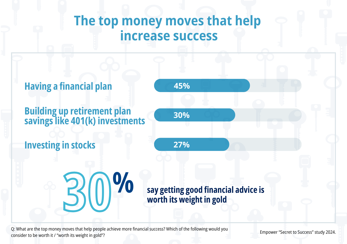人们认为,制定财务计划(45%)、建立退休计划储蓄投资(30%)和投资股票(27%)是能促进更大成功的最重要的理财举措。30%的人表示,获得好的理财建议是无价的。