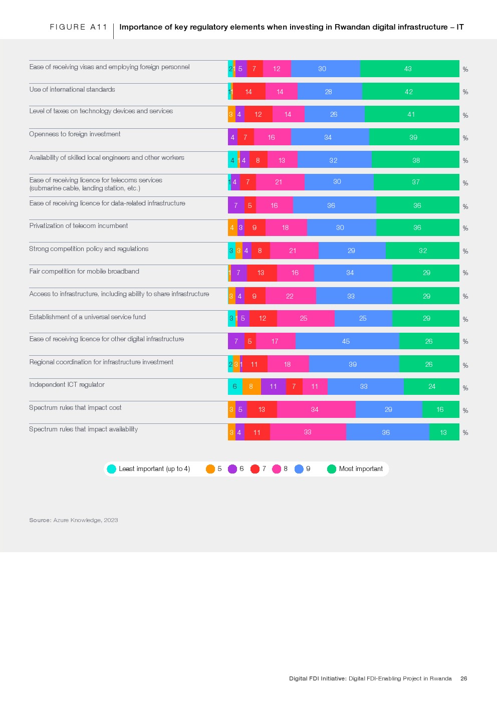 卢旺达制定了强有力的法律和政策框架来支持数字部门,包括没有对外国所有权或控制权的限制,优先考虑对信息和通信技术(ICT)公司、业务流程外包和金融服务等部门的投资;大力支持增加电子和信息通信技术设备制造的努力;以及推动数字技能发展的举措。