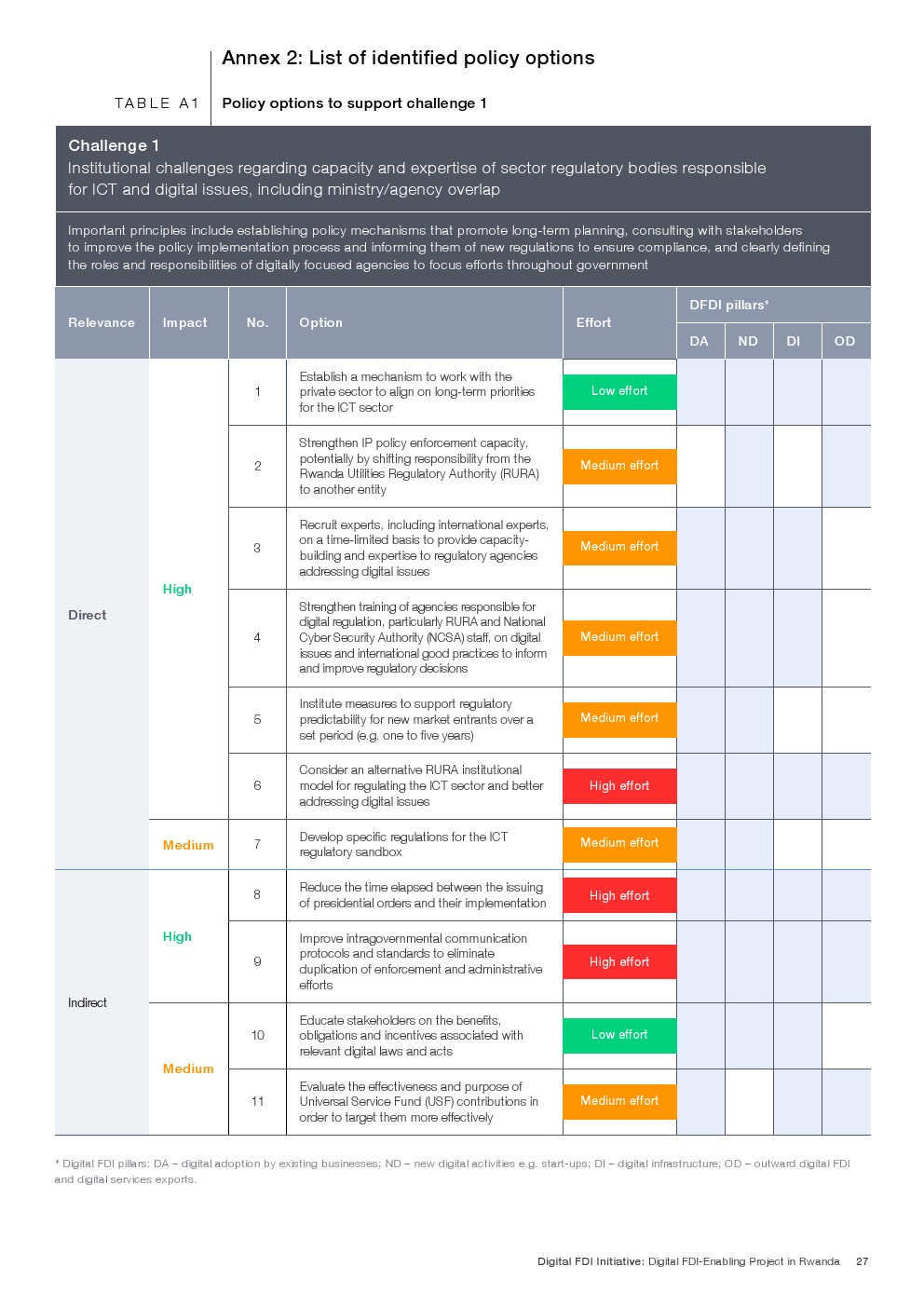 利益攸关方确定了可显著支持增加外国直接投资流动的政策行动,包括与知识产权相关的税收优惠、加强投资撮合平台、使大学课程与数字部门人力资本需求保持一致,以及促进跨境数据流动。