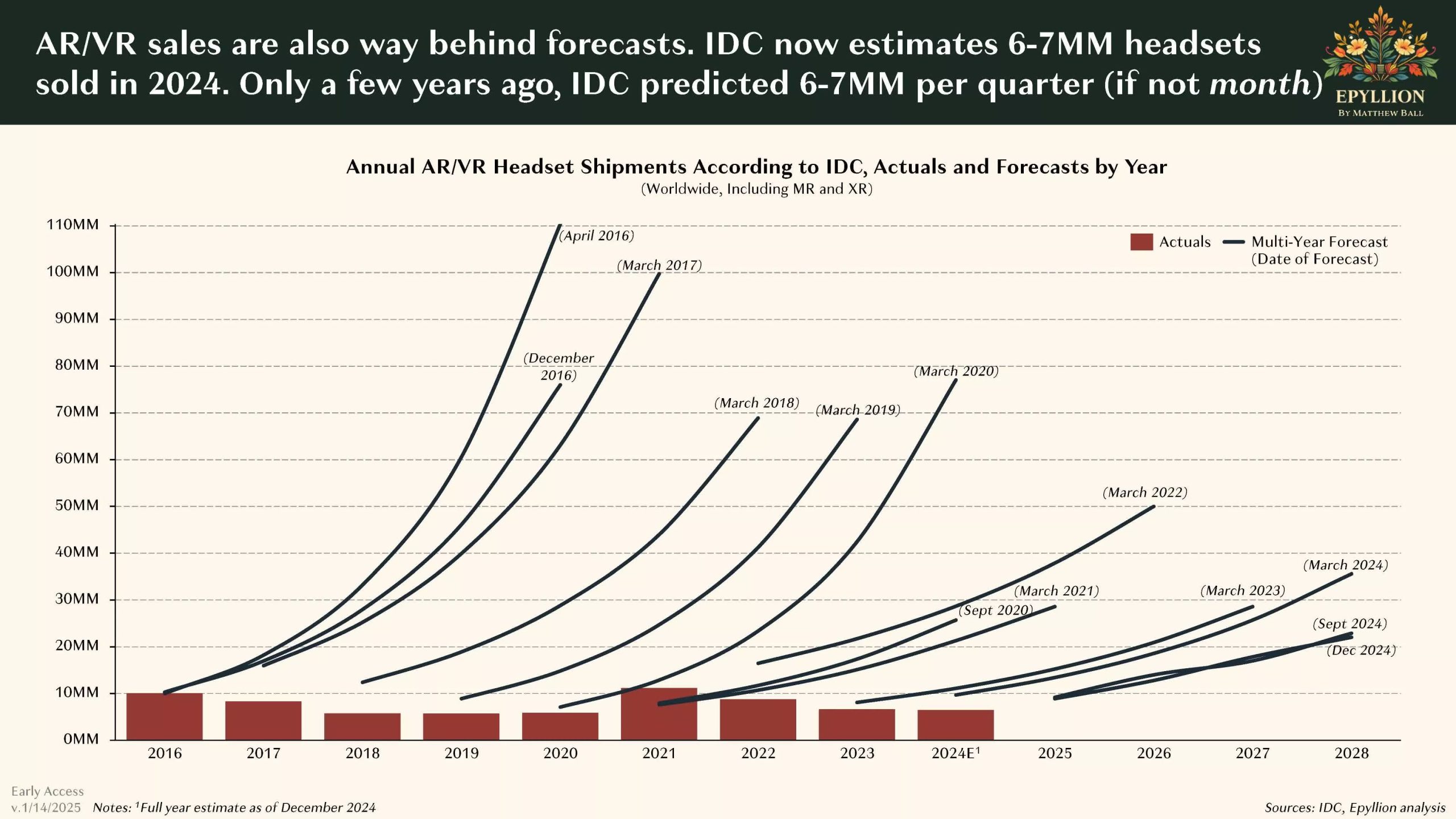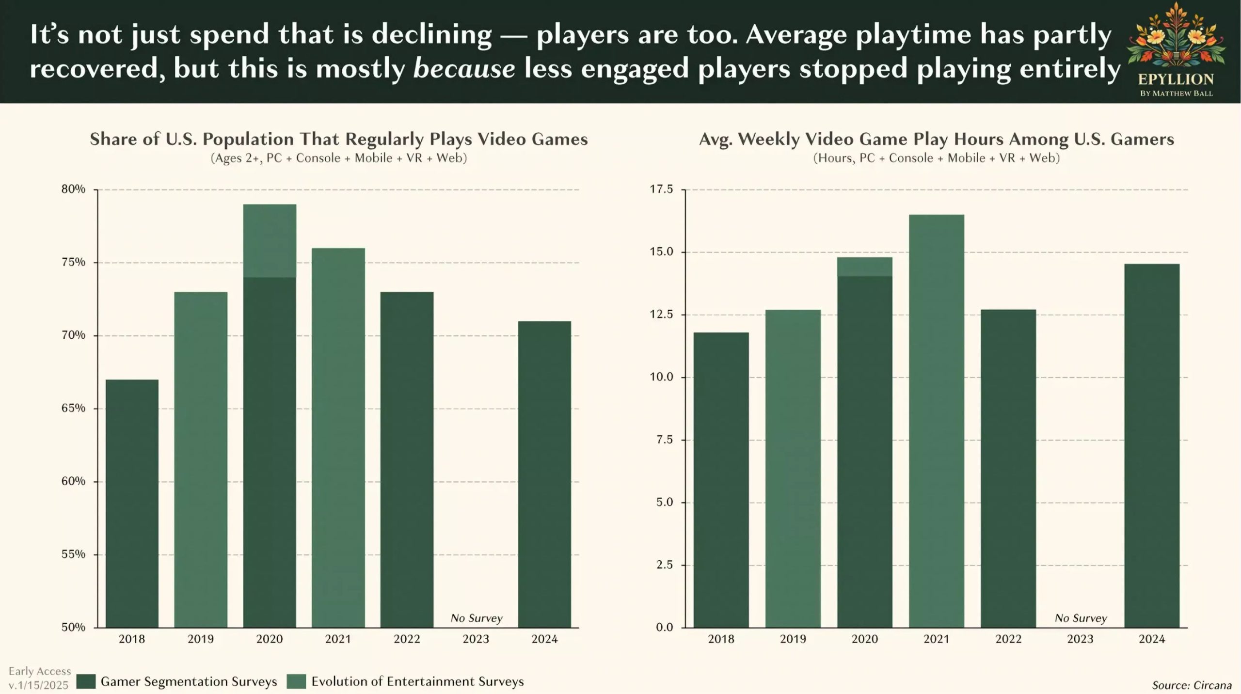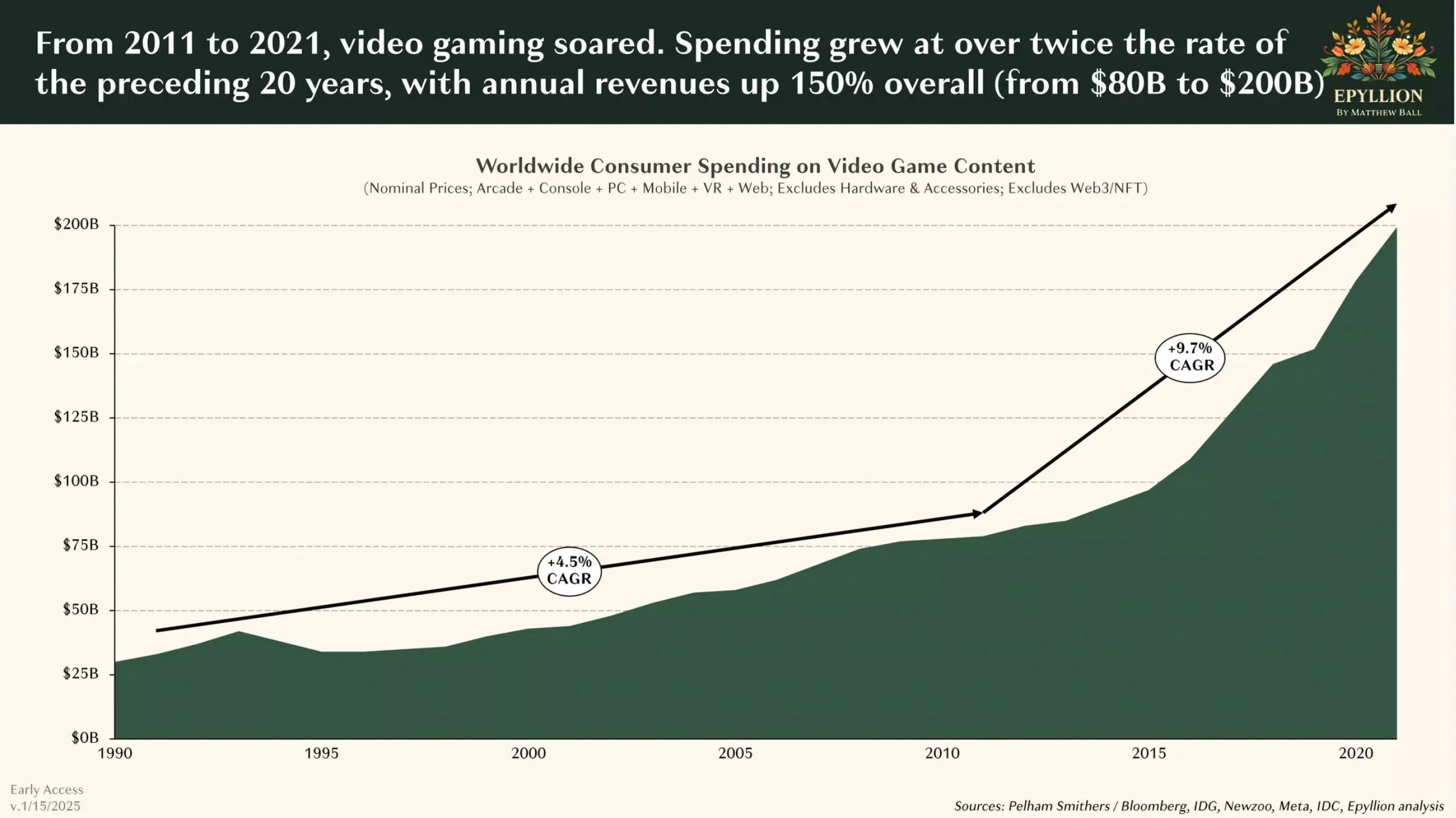 直到2024年,消费者在PC和主机游戏上的支出比2011年多了近500亿美元。但从2021年开始,主机游戏的增长开始放缓,Xbox Series S/X和PS5的销量就是一个例子。与此同时,PC游戏反而增长了20%。