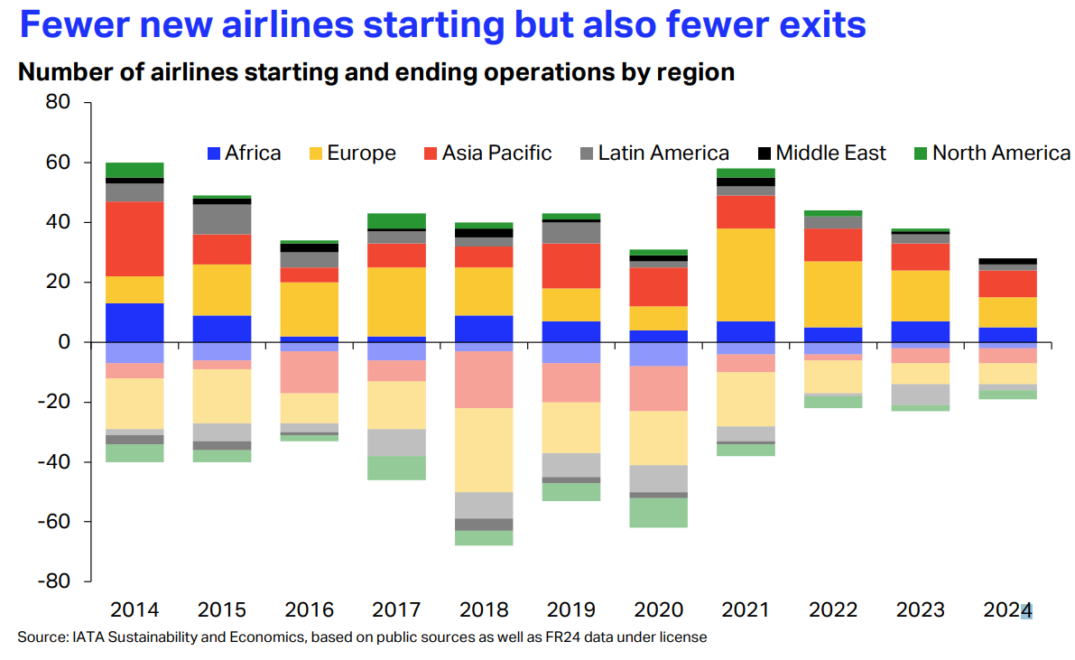 2024年,全球有28家新航空公司开始运营,同时有19家航空公司停止运营。这是十年来新进入者和退出者数量最低的一年,可能标志着市场暂时趋于稳定。