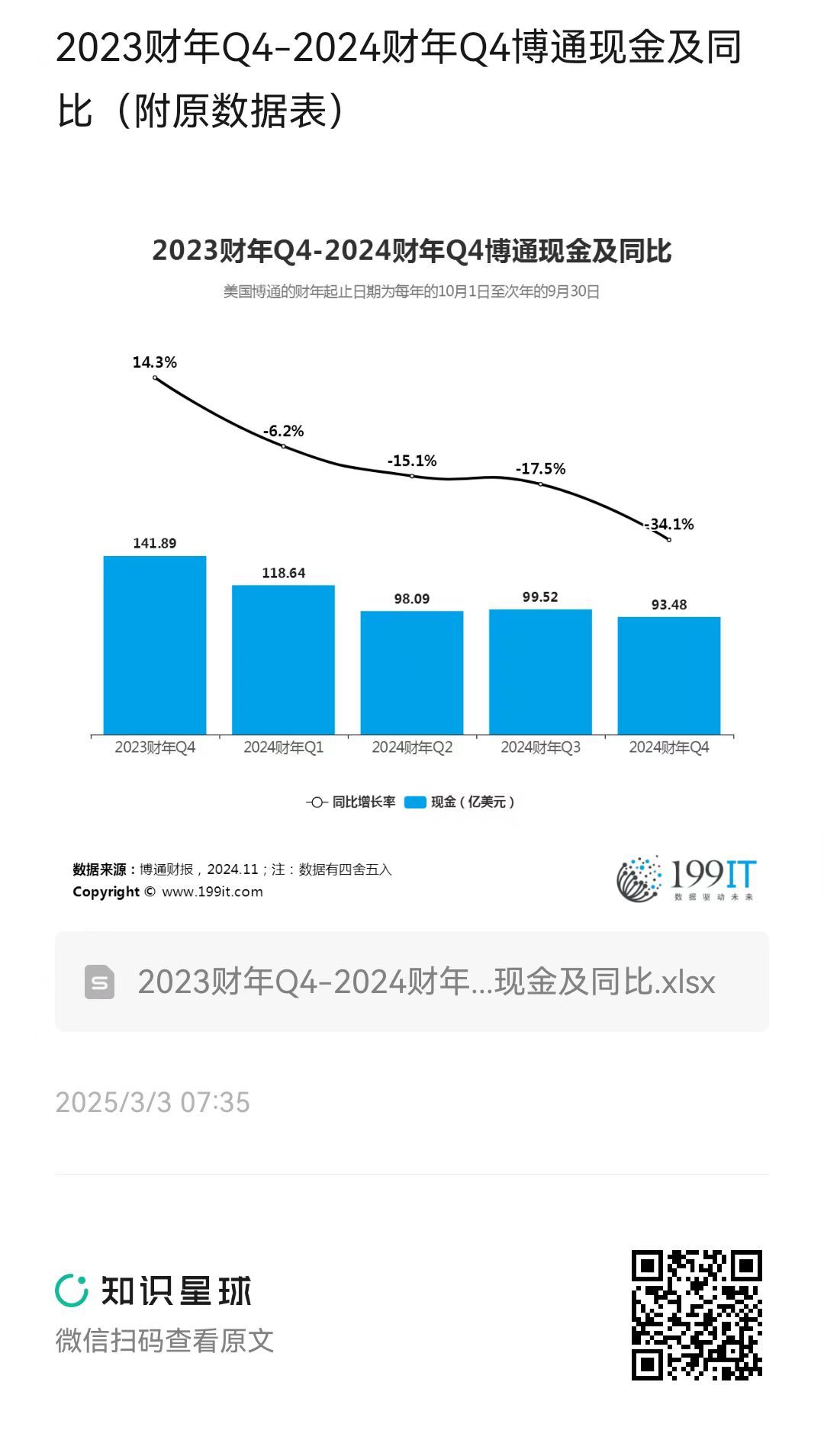 2023财年Q4-2024财年Q4博通现金及同比(附原数据表) ​​​