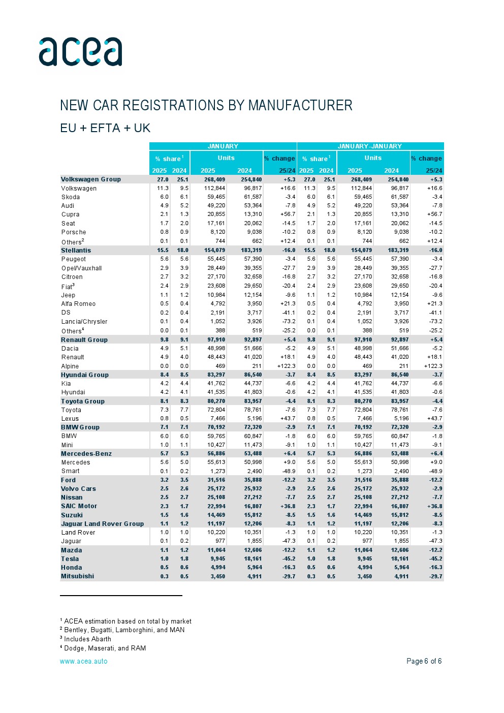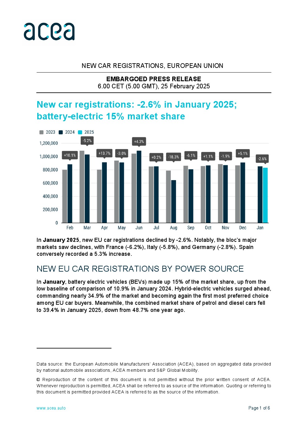 2025年1月,欧盟新车注册量下降了2.6%。值得注意的是,欧盟主要市场均出现下滑,其中法国(-6.2%)、意大利(-5.8%)和德国(-2.8%)的降幅较大。相反,西班牙的注册量增长了5.3%。
