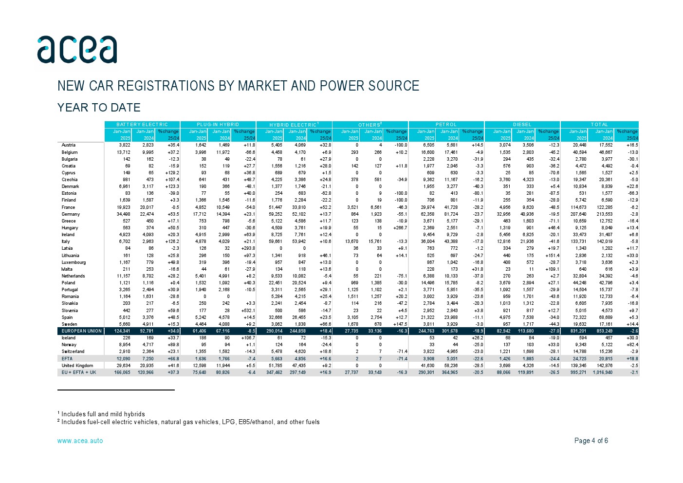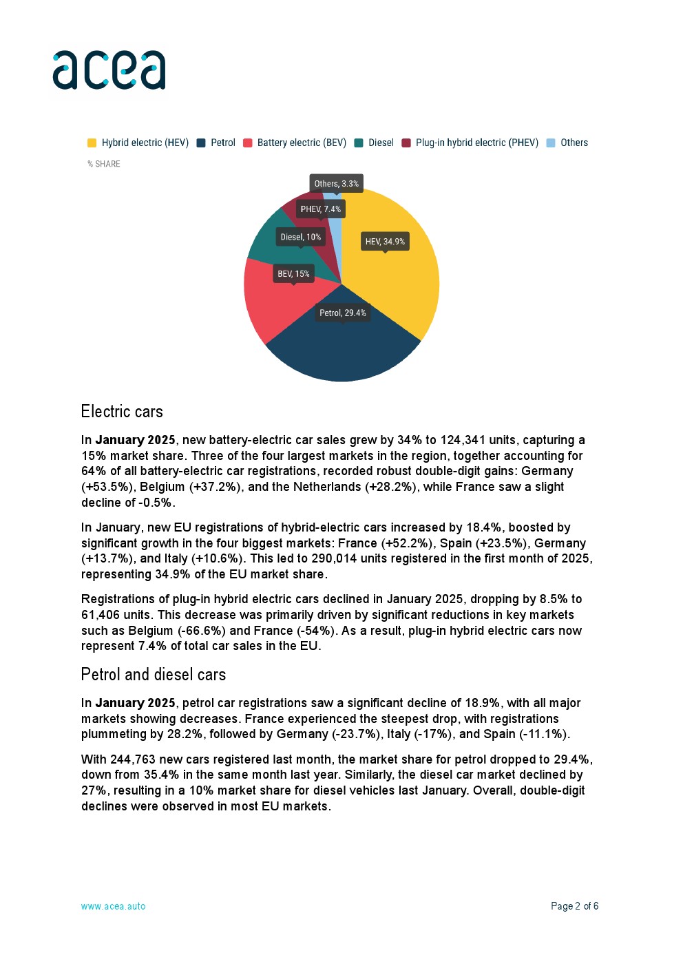 1月,汽油车的新注册量为244763辆,市场份额下降至29.4%,低于去年同期的35.4%。同样,柴油车市场下降了27%,导致2025年1月柴油车的市场份额为10%。总体而言,大多数欧盟市场都出现了两位数的下降。